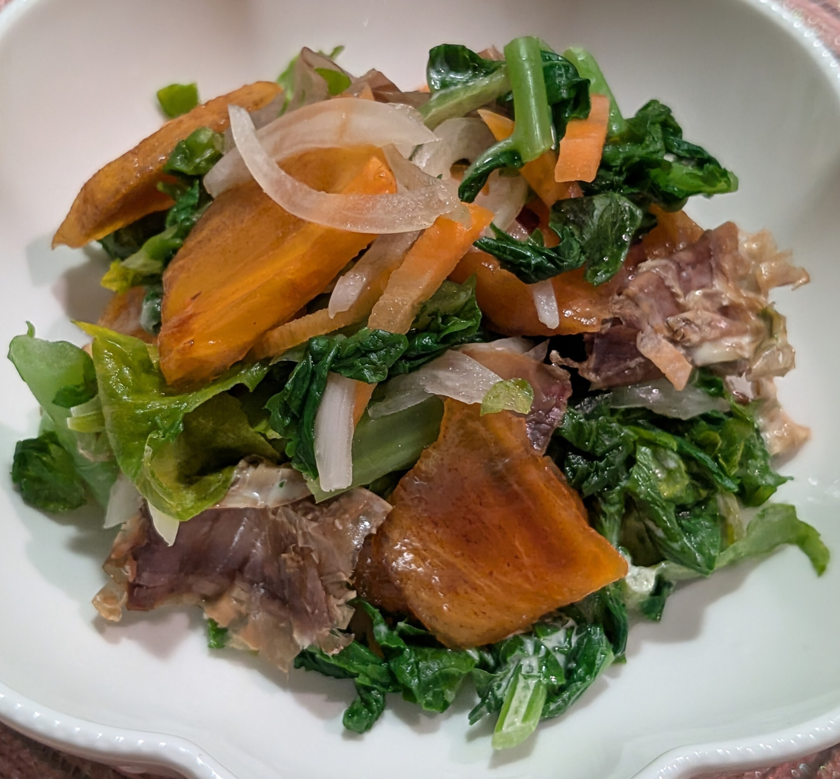 【大根葉とたまねぎと柿と出汁をとったあとの鰹節の柚子果汁とポン酢マヨ和え】