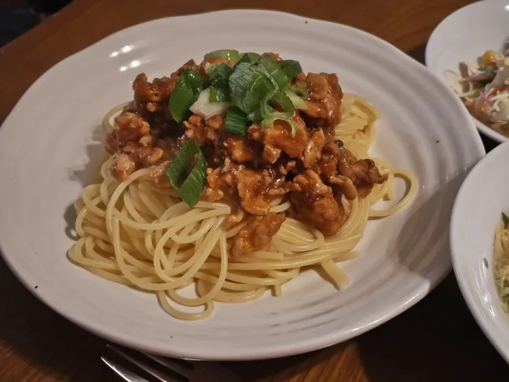 市販デミグラスソースが1人前しか無かったので、そこに味噌とお酒を加えてかさ増し味変を。さらにマヨネーズを加えまろやかソースに。椎茸と切り落としの豚肉を微塵切りにして塩コショウ。オリーブオイルで炒めソースを加え煮詰めてパスタにかけました。仕上げにオリーブオイルをかけネギをのせて完成。