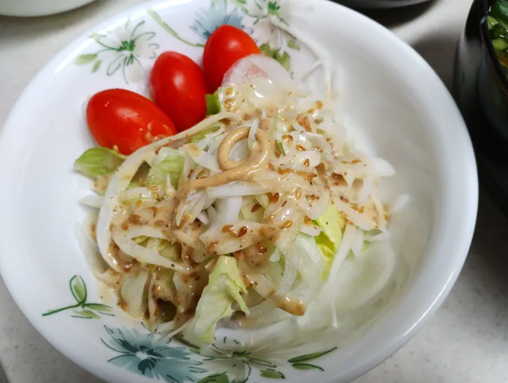 オニオンサラダ(深煎りごまドレ+世界マヨしびれ麻辣味)