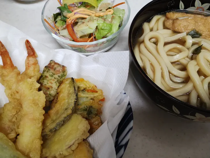 美味しいそうなきつねうどんと天ぷらとサラダですね。