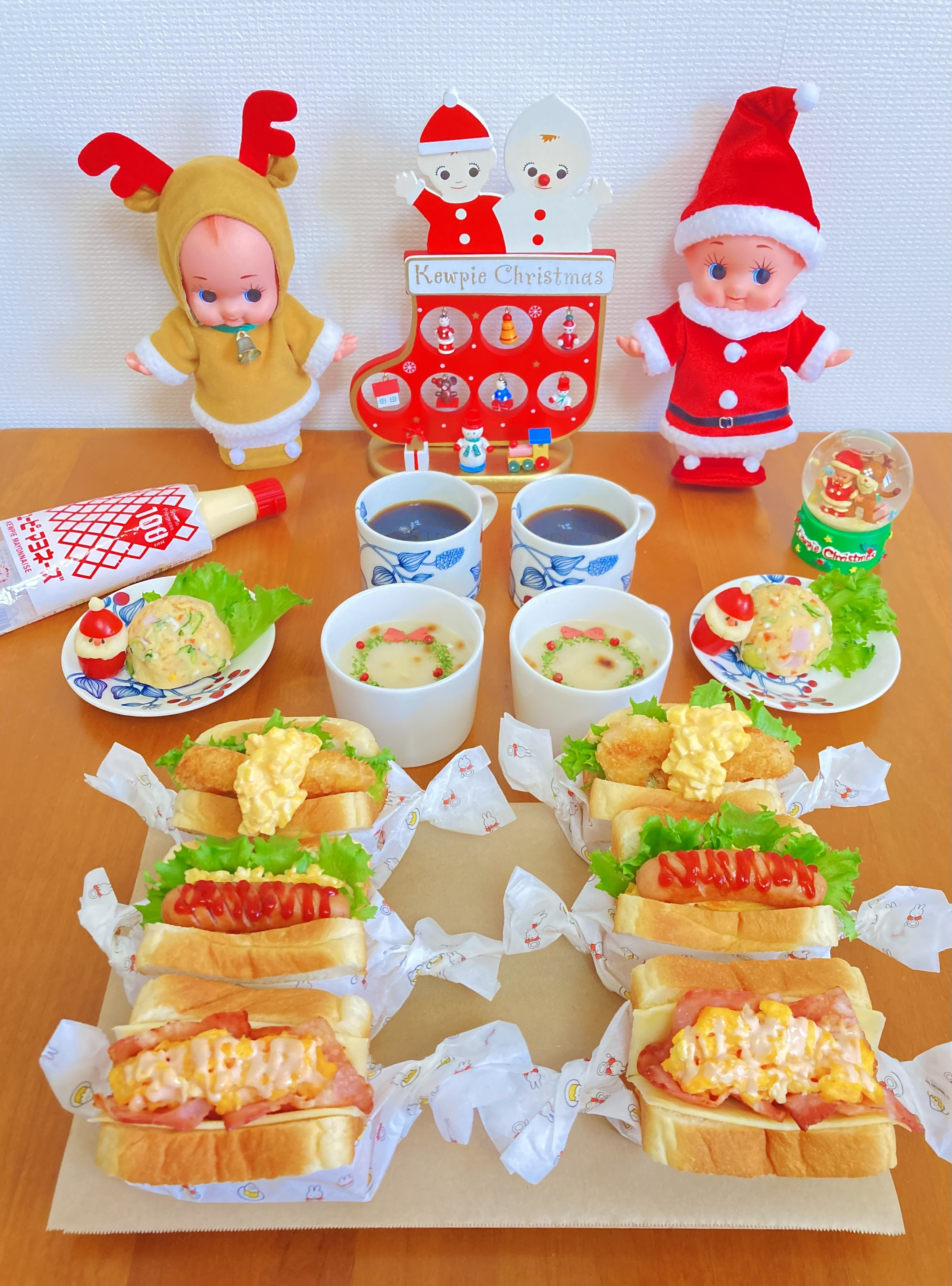 彩り綺麗で何れもとっても美味しそうです。スープのリースやミニトマトのサンタさん、サンドイッチのキャラメル包みなど綺麗にお料理されていて素晴らしいですね。キューピーちゃんのサンタさんトナカイさん、オーナメントやスノードームで幸せな気持ちになりました。🌻
