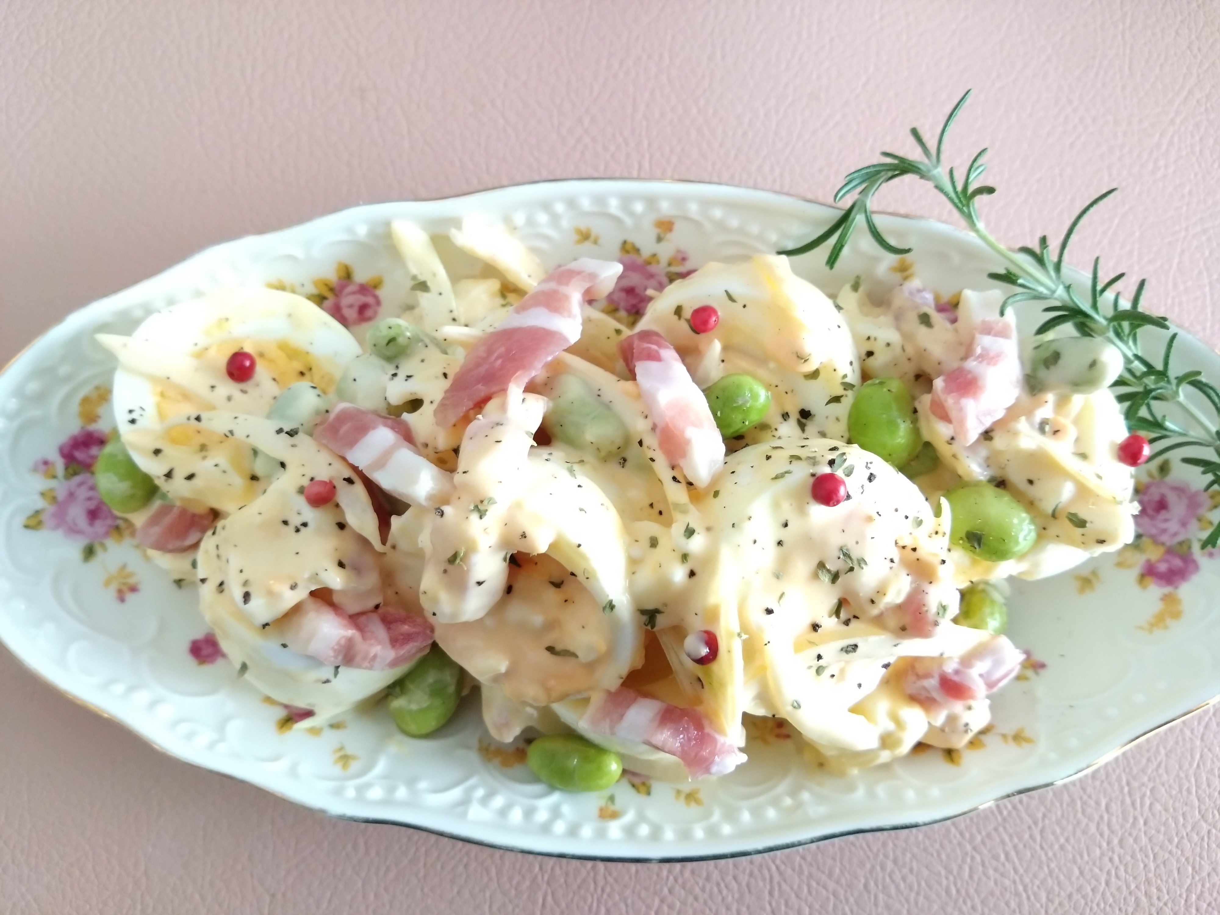 ゆで卵1個はつぶして、マヨネーズ枝豆、スライスたまねぎ生ベーコンとあわせ