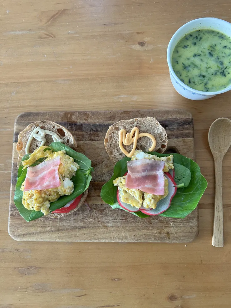 今朝のモーニングサンドは、念願の(いつも入れるの忘れるので)とろとろマヨチーズタマゴ焼き入り!フライパンにマヨを出して、チーズ、卵を直接投入!混ぜ混ぜしながら炒めたら、牛乳入れなくても、ふんわりとろとろ卵焼きの完成!こうして写真を撮ってみたら、お口を開けてるサンドさんたちに見えます。目玉を付ければよかったかな😄大根、小松菜、ベーコン、バンズにはトリュフマヨと、シラチャーマヨをそれぞれトッピングしました♡あ、食べたのは一つです♡
