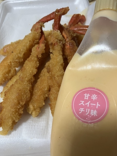 昨夜は冷凍のカニ爪フライをスイートチリで食べました🦀
