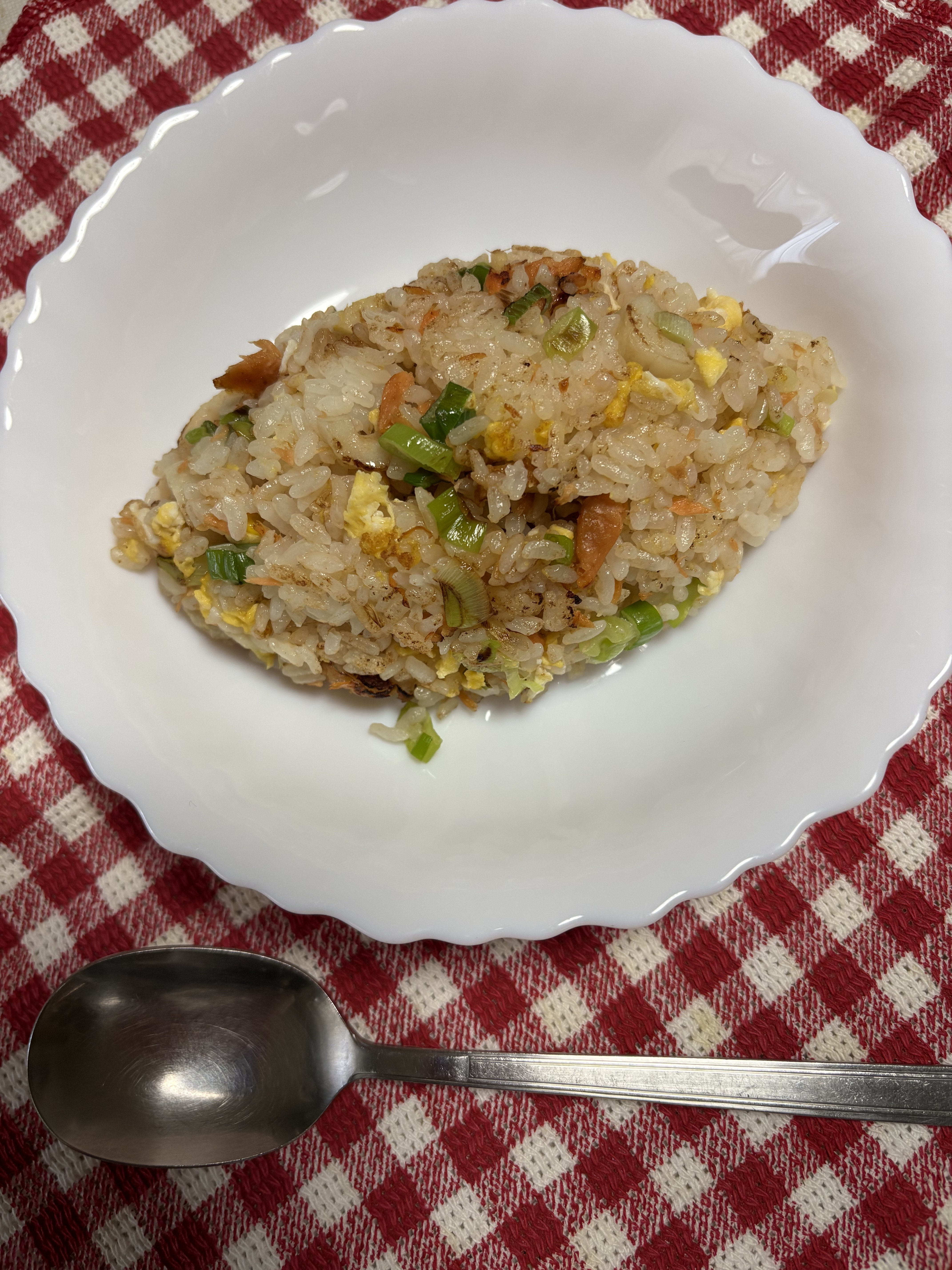 昨日はお昼から検査があったので朝食後パパッとチャーハン作りました。マヨでご飯を炒めてから、鮭(瓶🫙入)、ちくわ、長ネギにマヨを入れ、マヨ入卵をフライパンの端で炒め、全体を炒め合わせました。帰宅後、ゆっくり頂きました☺️🙏
