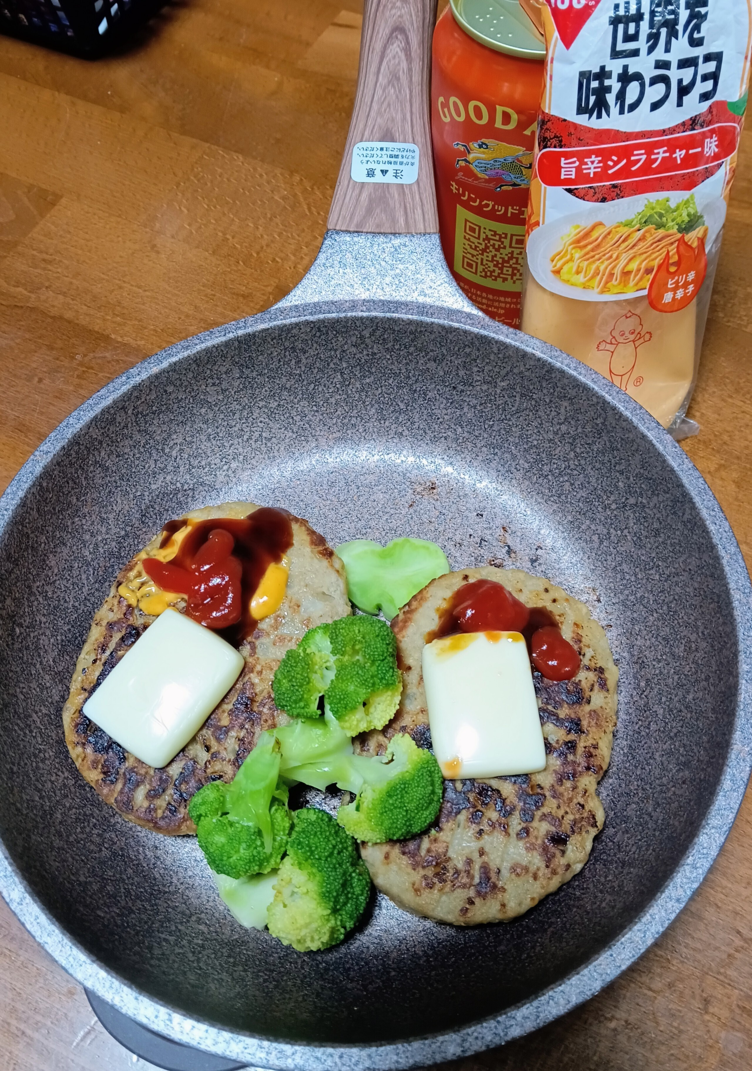 ハンバーグが食べたくて冷凍庫にある市販のハンバーグを焼きました。