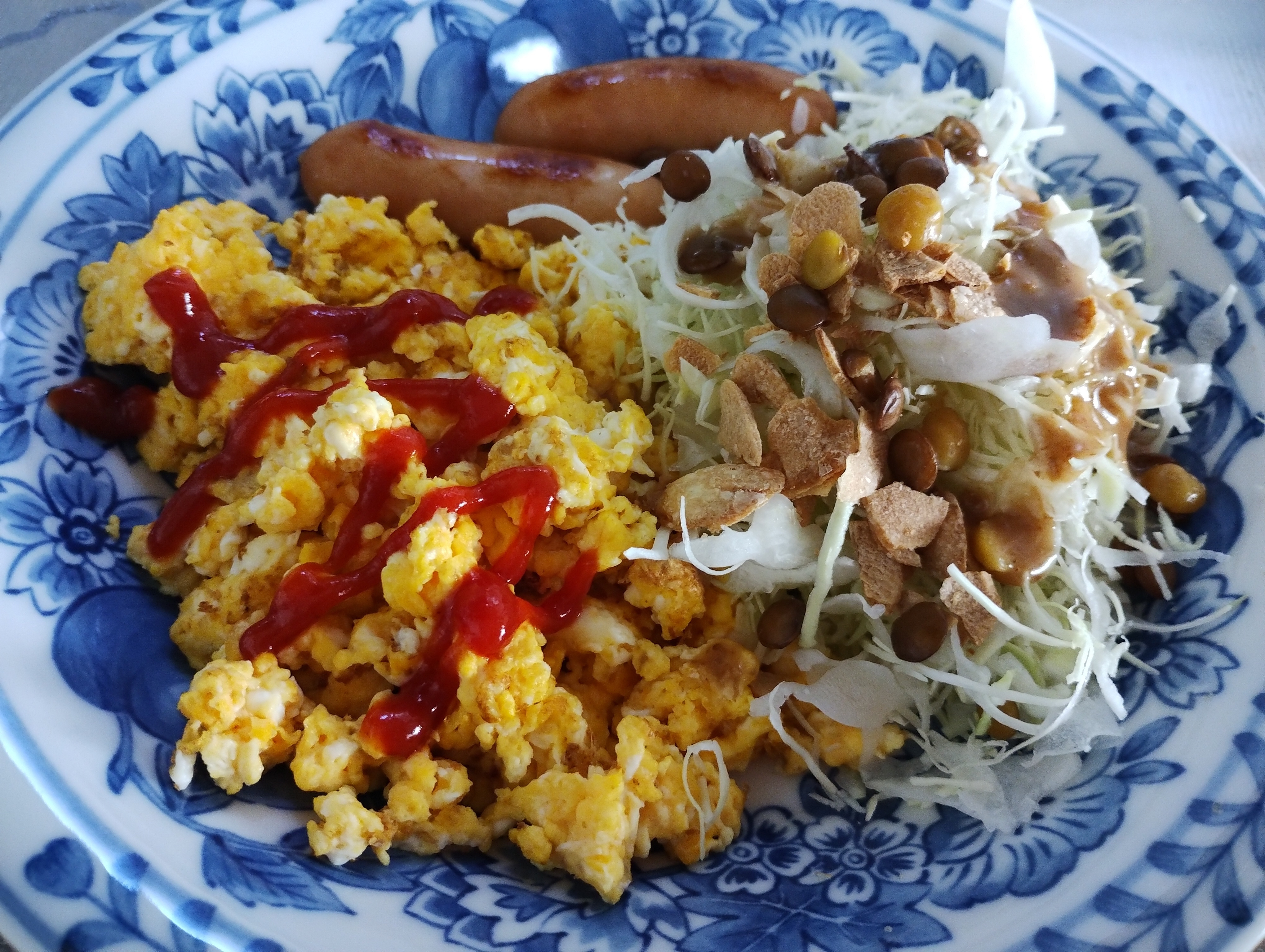 千切りキャベツにサラダクラブさんのフライドガーリック、レンズ豆&ひよこ豆をトッピング
