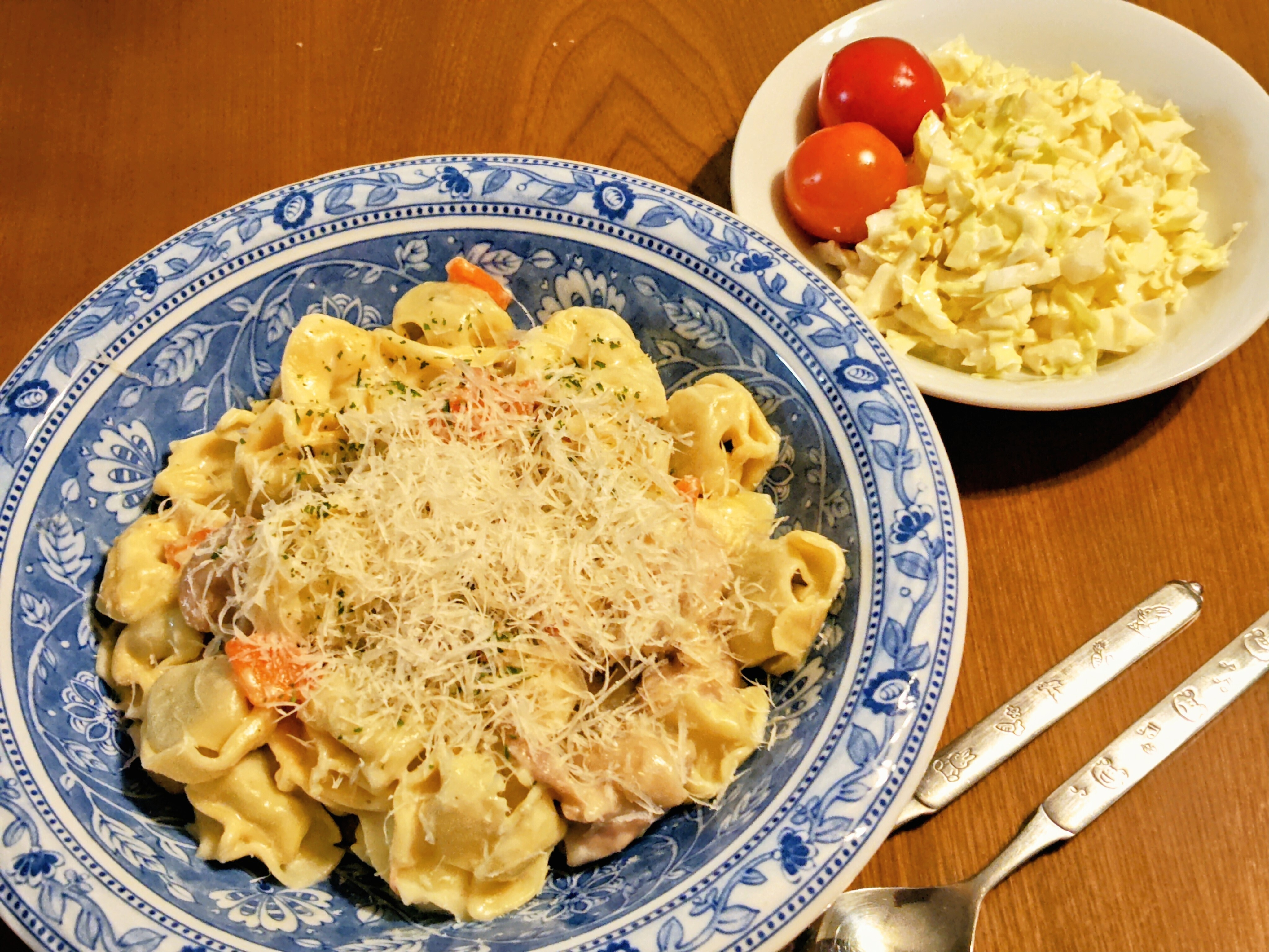 投稿を表示トルテリーニのチキンクリームソースとサラダ、とっても美味しそうですね。🌻