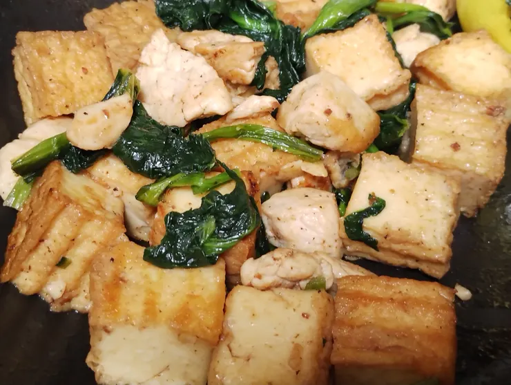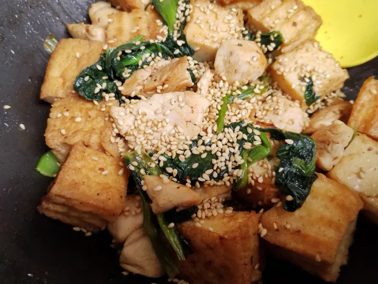 ●鶏ささみと厚揚げと小松菜をキユーピーマヨネーズと世界マヨ しびれ麻辣味で炒めました( 鶏がらスープ、料理酒)