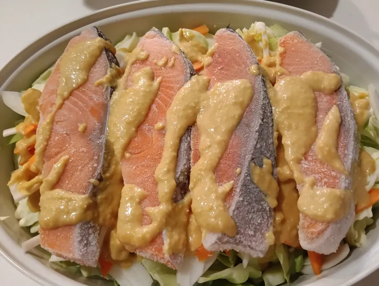 ホットプレートで鮭のちゃんちゃん焼きを作りました(^^)ソースは、マヨにお味噌と砂糖でちょい甘め♡野菜もたっぷり食べられました〜!