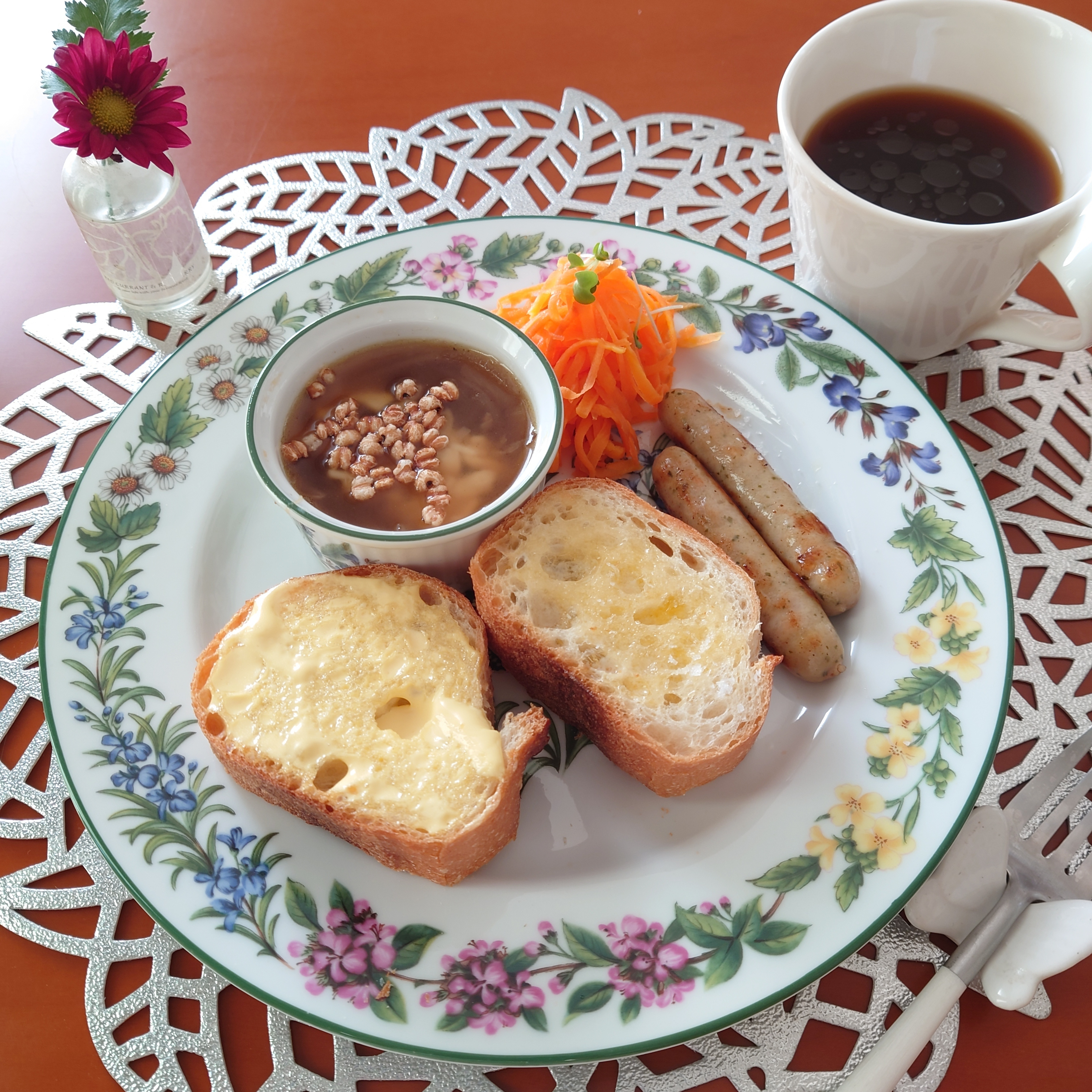 マヨトーストとバタートーストの2種類と、人参のサラダ、ソーセージ、オニオングラタンスープを盛り付けました😋