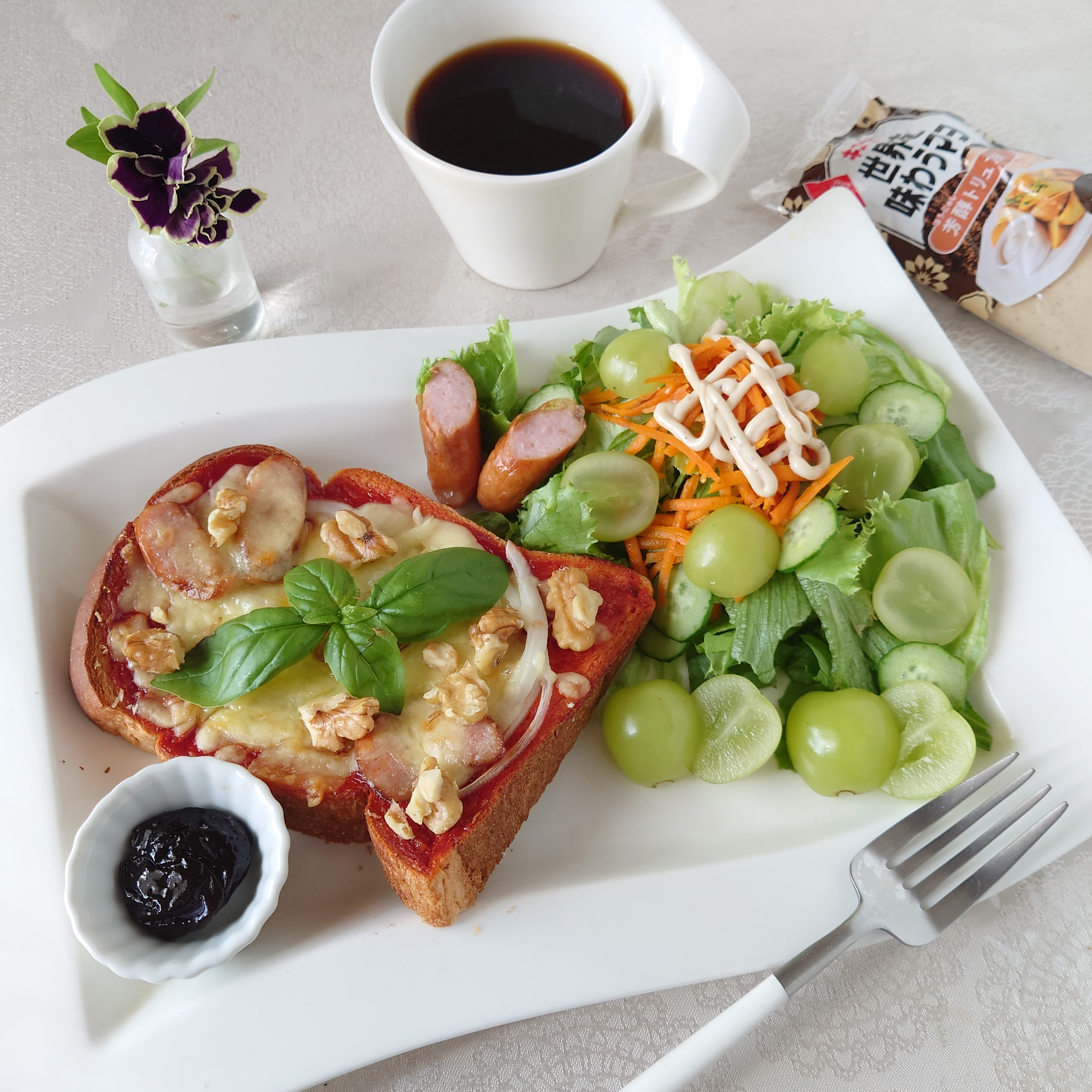 くるみたっぷりのピザトーストに、シャインマスカットのサラダとっても美味しそう。