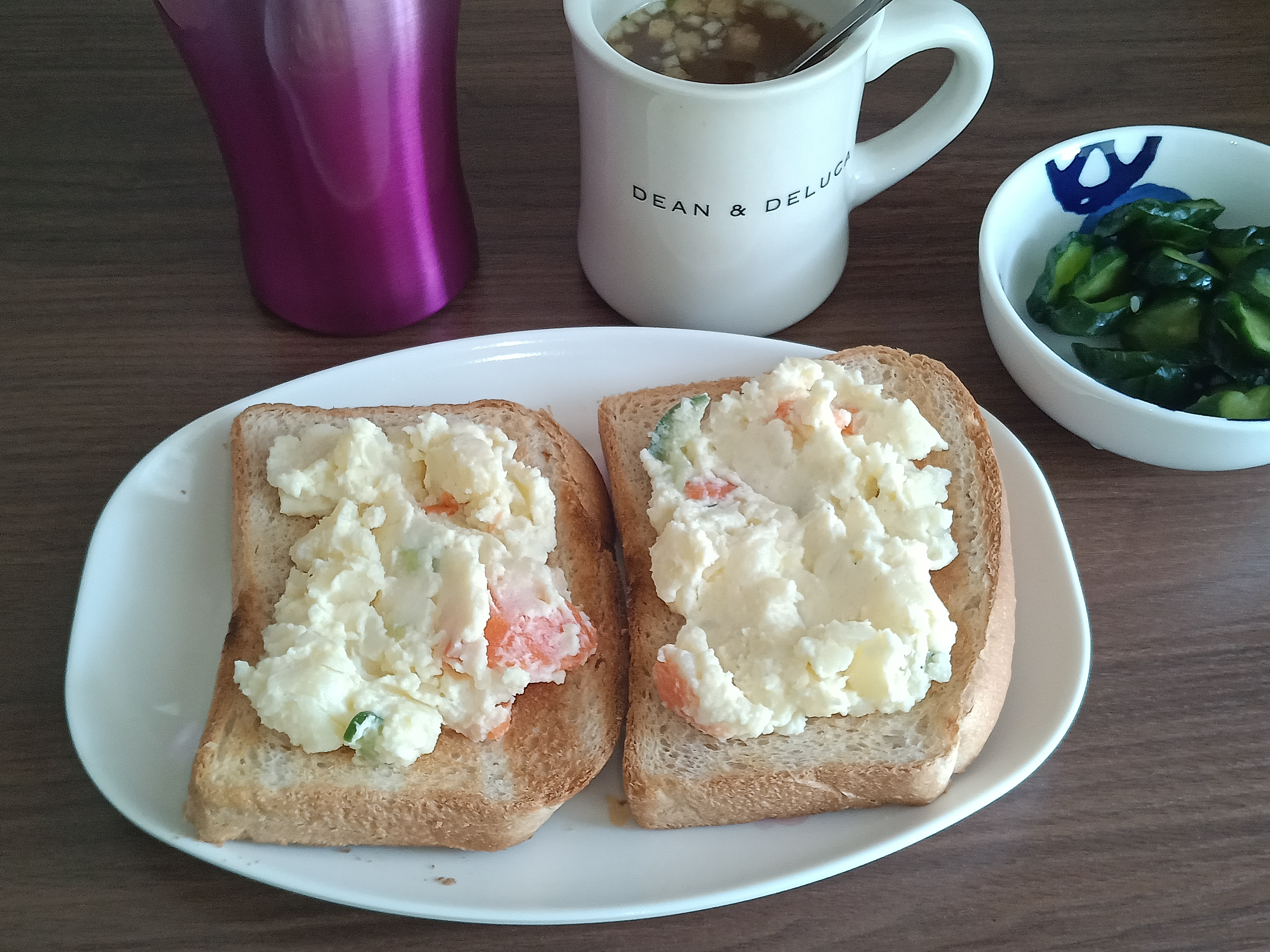 低糖質パンにポテトサラダを乗せました❤️一口食べたら物足りず追いマヨをしてしまいました‼️箸休めにキュウリの浅漬けも添えました。なぜか合うんですよねw