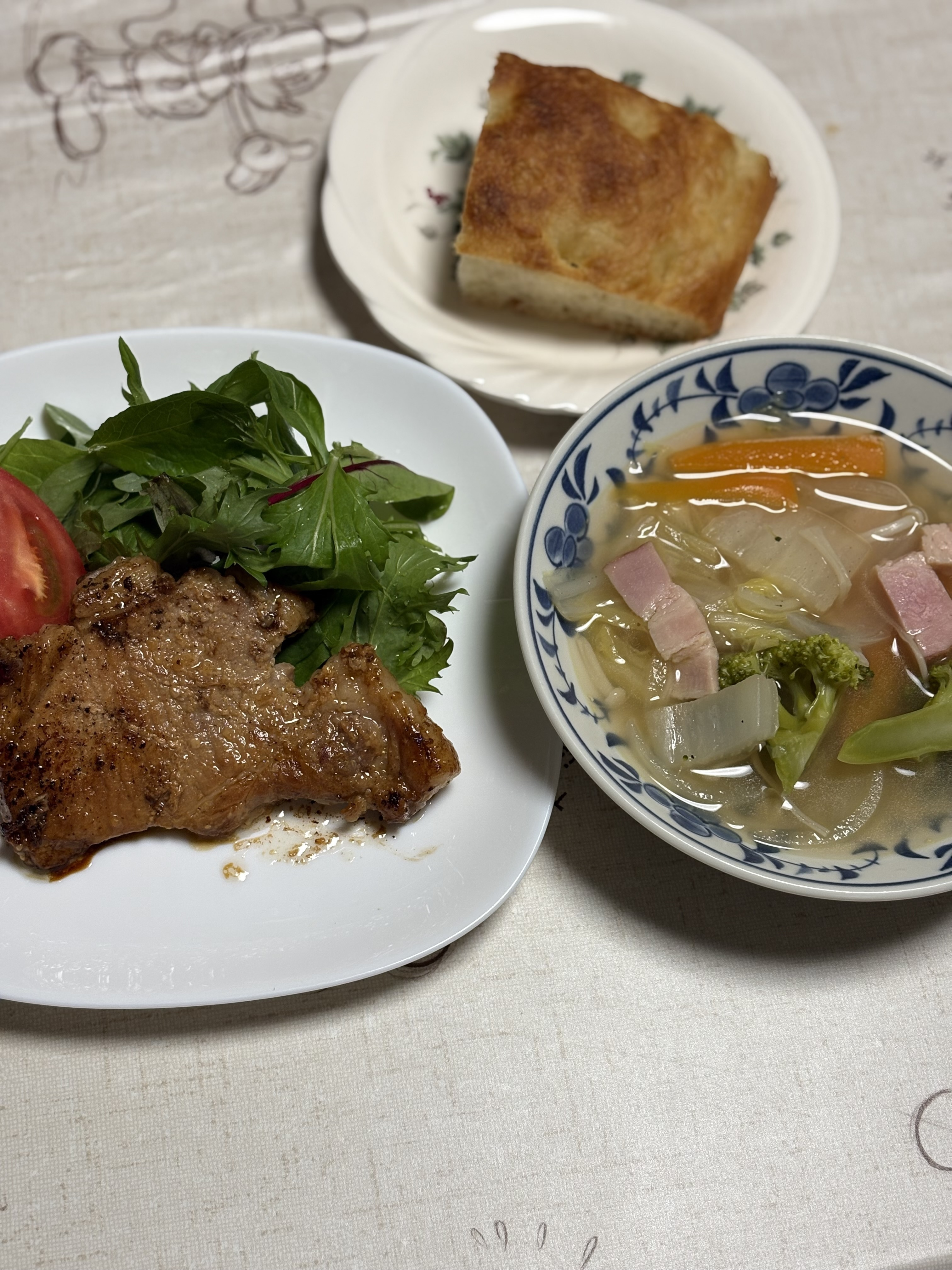 豚肉のソテーはマヨと塩麹をつけて焼きました。野菜スープはベーコン🥓、白菜、玉ねぎ、人参、エノキ、ブロッコリー🥦を使いマヨソテーしてコンソメで煮込みました。塩麹フォカッチャと一緒に頂きました。