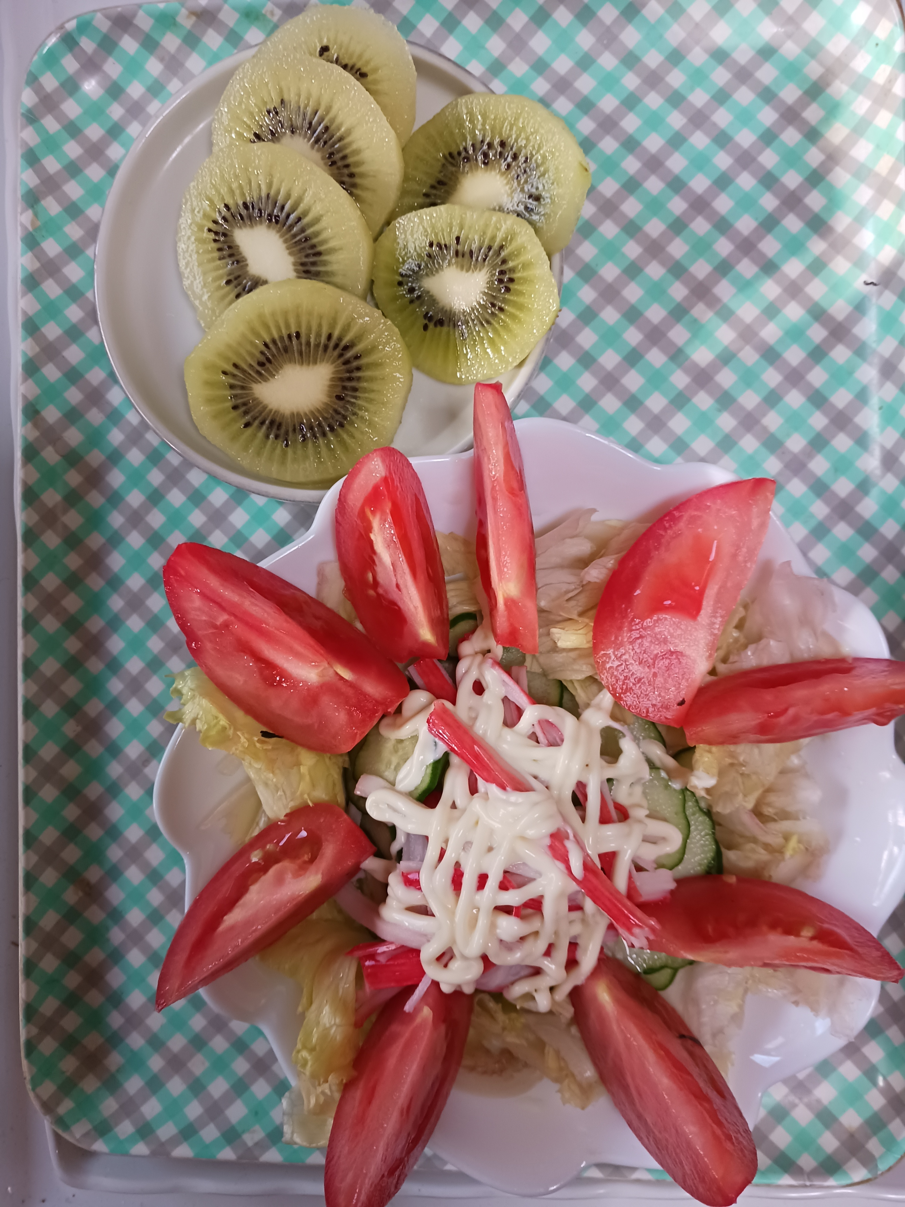今日は朝時間があったので頑張って🦀カニかまキュウリ🥒のサラダ作ってみました。たっぷりのトマト🍅を飾りました。少しは上達しているかしら…😅