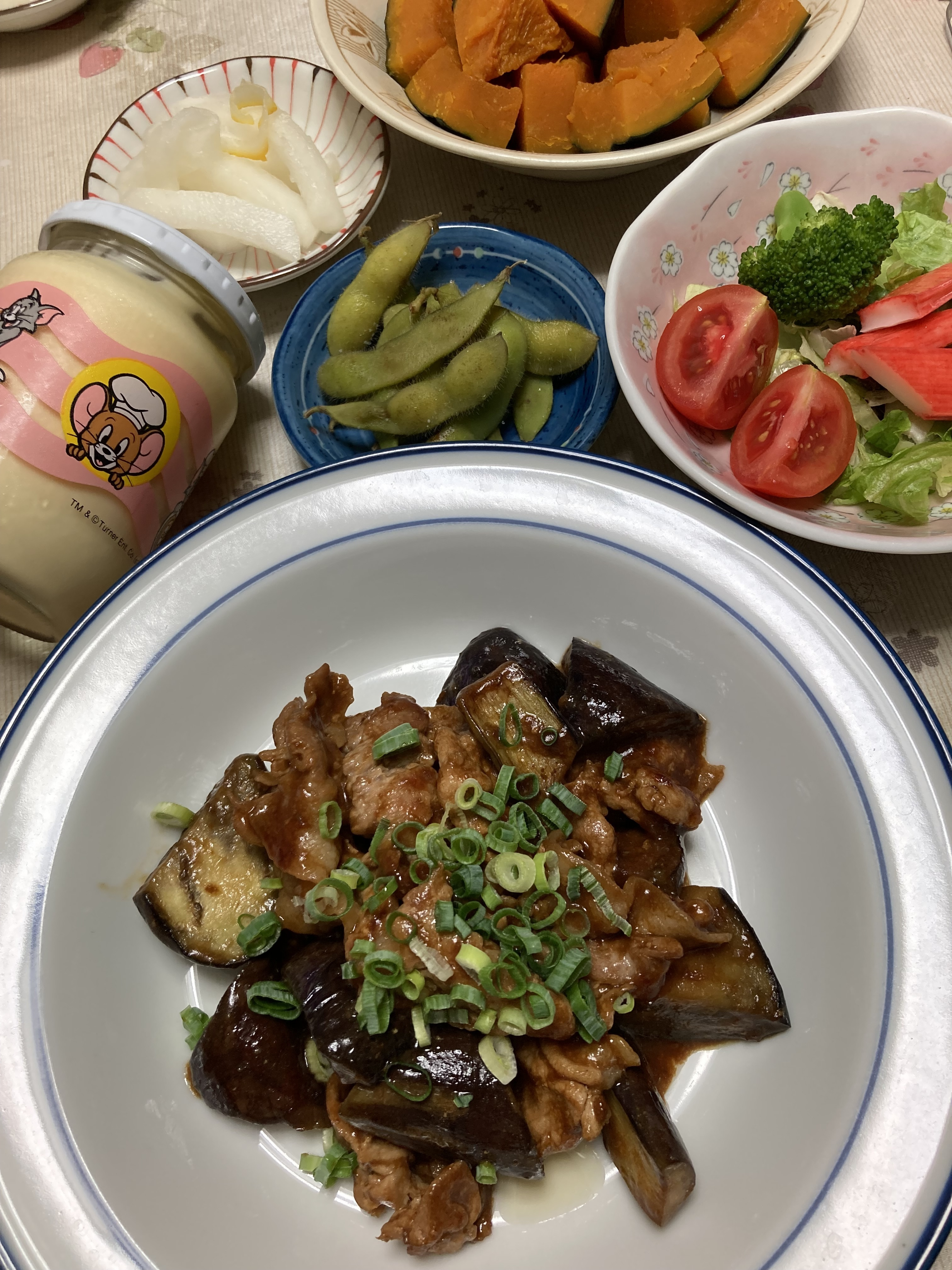 投稿を表示豚こまとなすの味噌マヨ炒め、ご飯が進みそうです。野菜サラダとかぼちゃ🎃の煮物と枝豆、お野菜たっぷりの食卓で良いですね。🌻