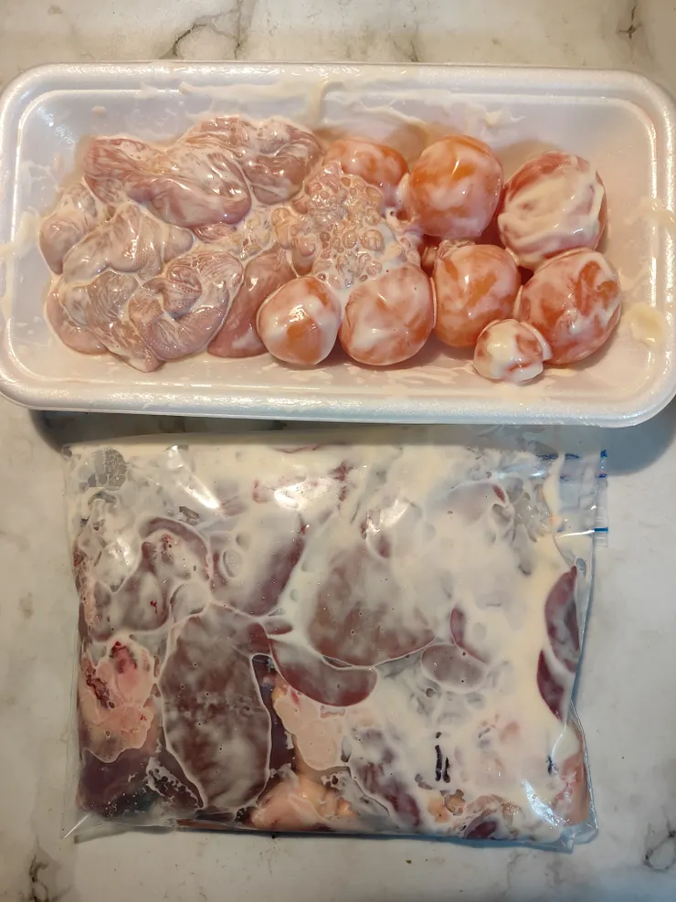 鶏の心臓は切り開き、レバーはそのままで保存袋に入れマヨ漬け…玉ひもはトレーの中で軽くマヨもみ…さて、この実験はどうなる?!ドキドキ💗