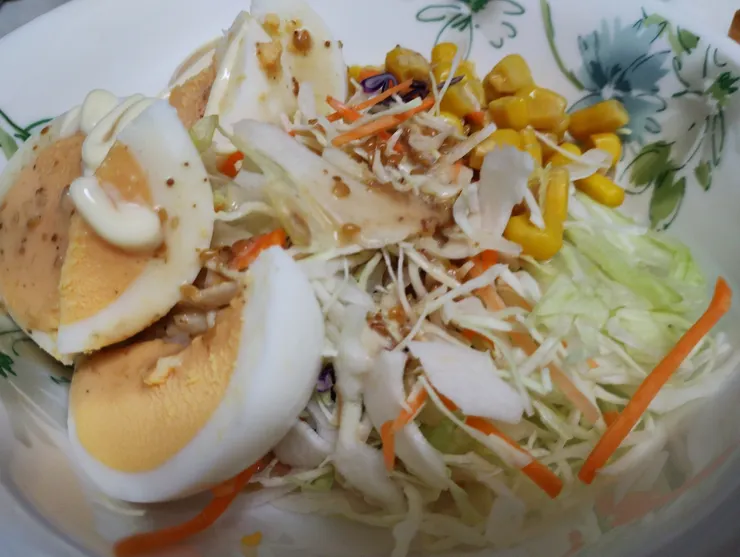 野菜サラダに深煎りごまドレッシングとキユーピーハーフをかけました
