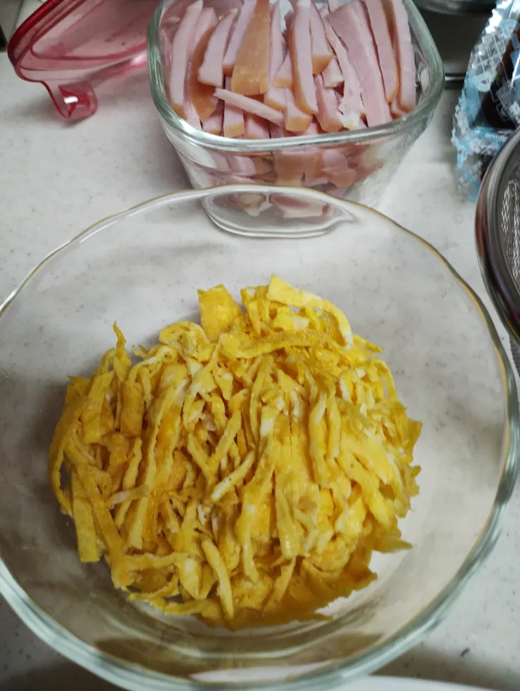 具材は、ロースハム、錦糸卵、きゅうり、カニカマ、レタス、紅生姜
