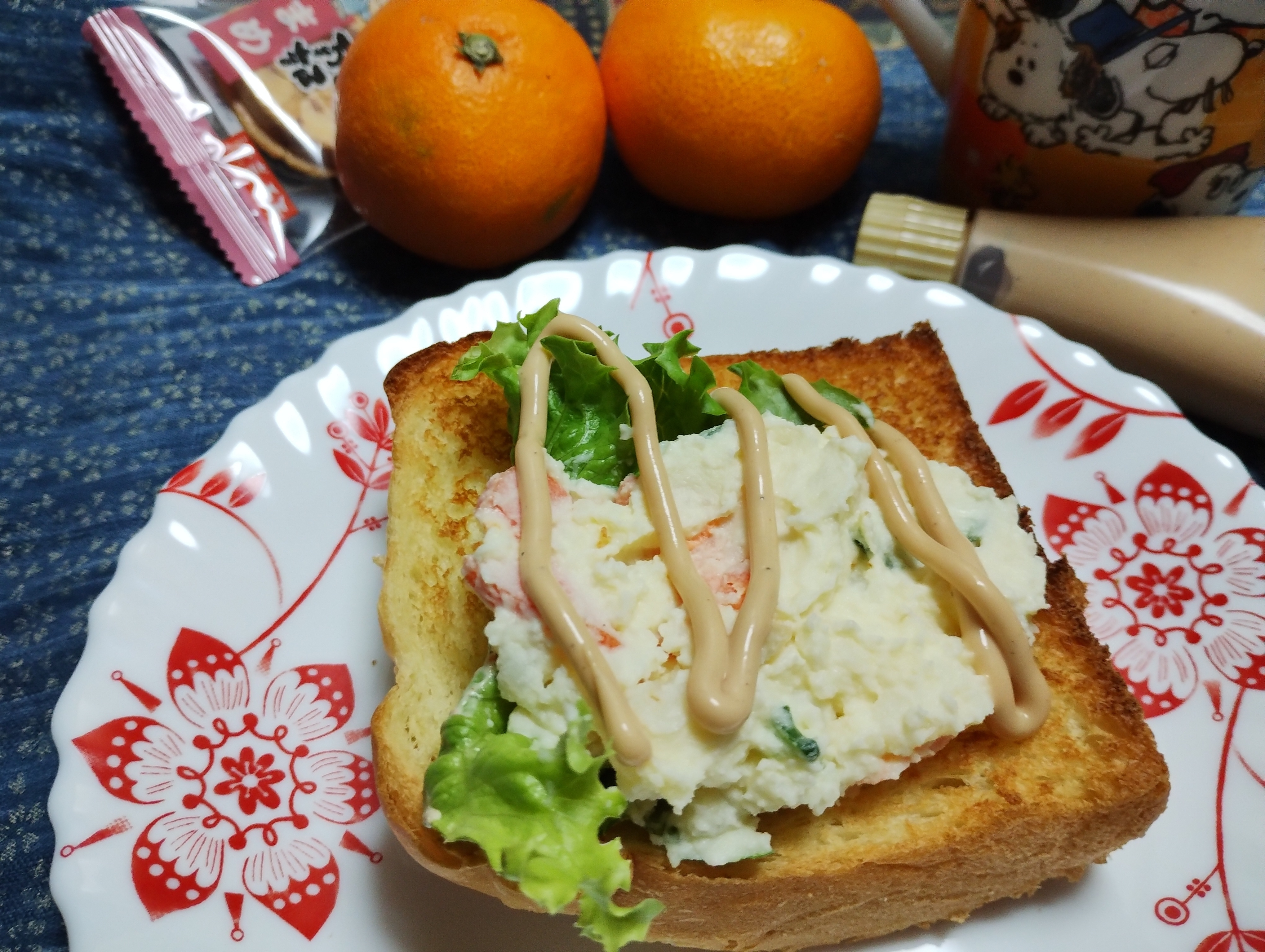 トーストにポテサラをのせ 世界を味わうマヨ 濃厚BBQソース味を掛けて頂きました