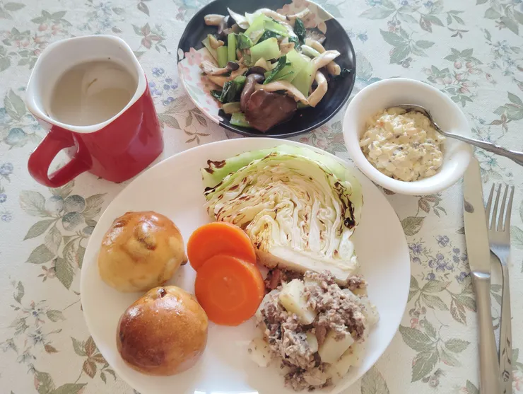 焼きキャベツ、茹でたジャガイモ&いわしの缶詰、茹で人参。