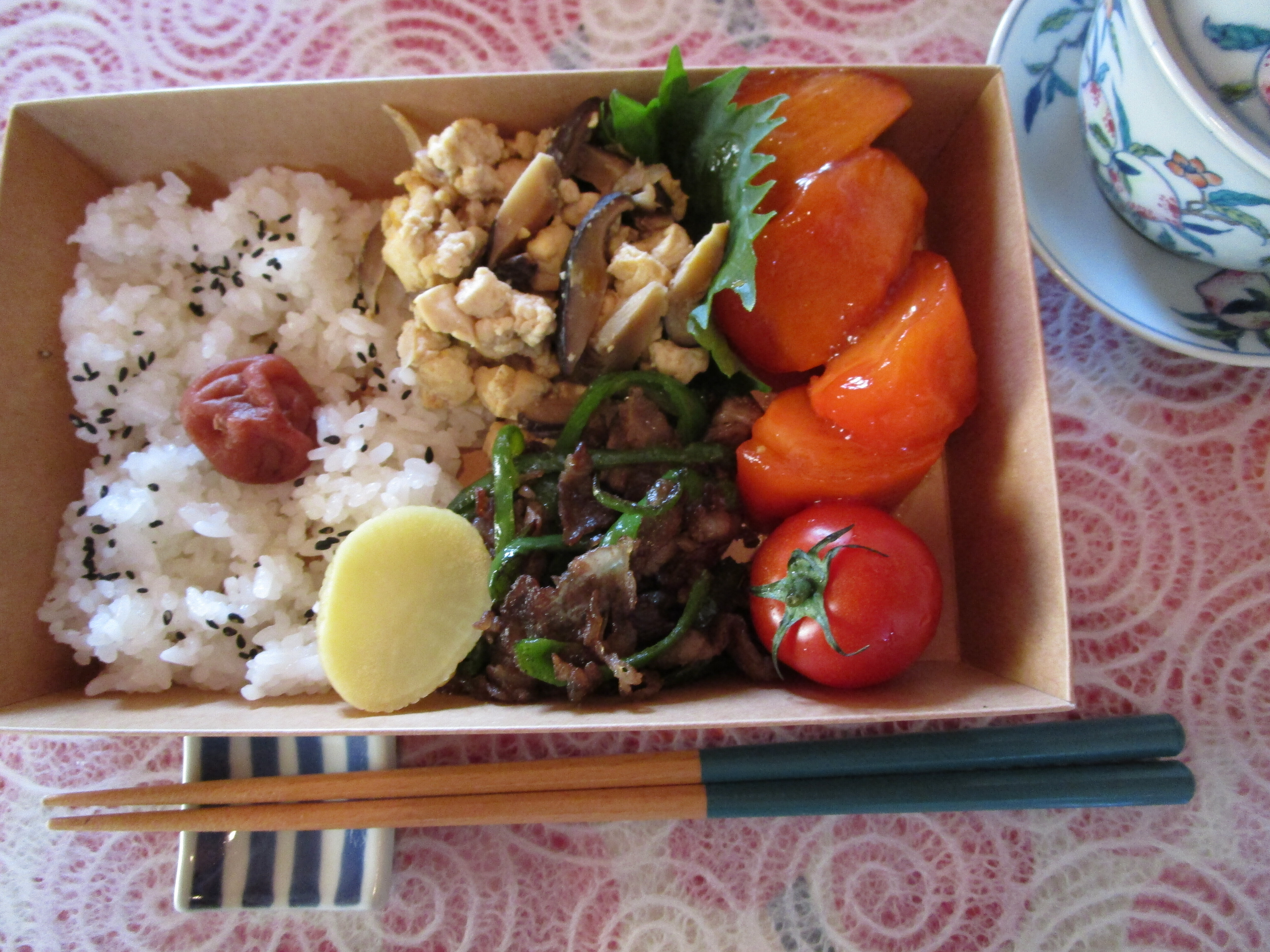まぜ寿司の味付けした椎茸とごぼうで炒り豆腐、切り落としの宮崎牛も柔らかく熟した柿もとろっとして、何れも頂きたくなります。朝食にお弁当でも良いですね。🌻