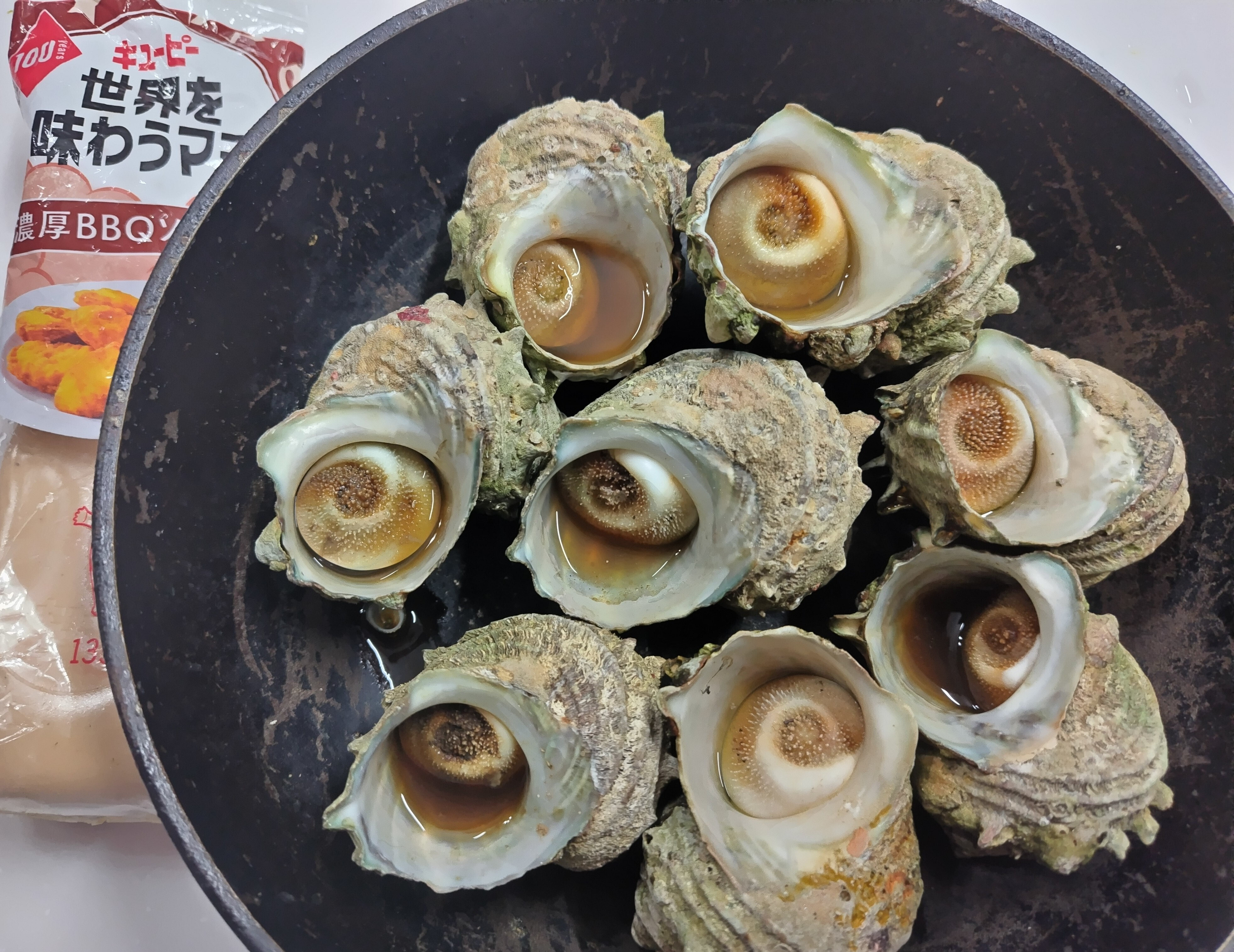 漁業組合のお祭りでサザエ買うことができ、料理酒入れ蒸し焼きにしました。自然の塩味で頂き、濃厚BBQソース味のマヨネーズでも美味しく頂きました。🌻