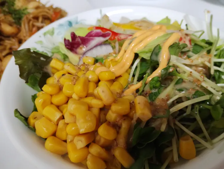 ●野菜サラダに深煎りごまドレと世界マヨ 旨辛シラチャー味を掛けて頂きました。