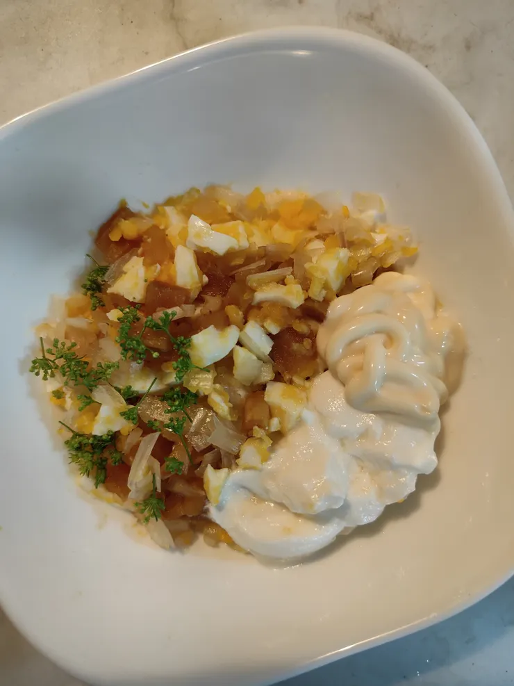 ゆで卵・自家製らっきょう・割干大根ハリハリ漬け・ヨーグルト・マヨネーズ・(ベランダの)イタリアンパセリのつぼみ♪ヘルシータルタル作りました✌️