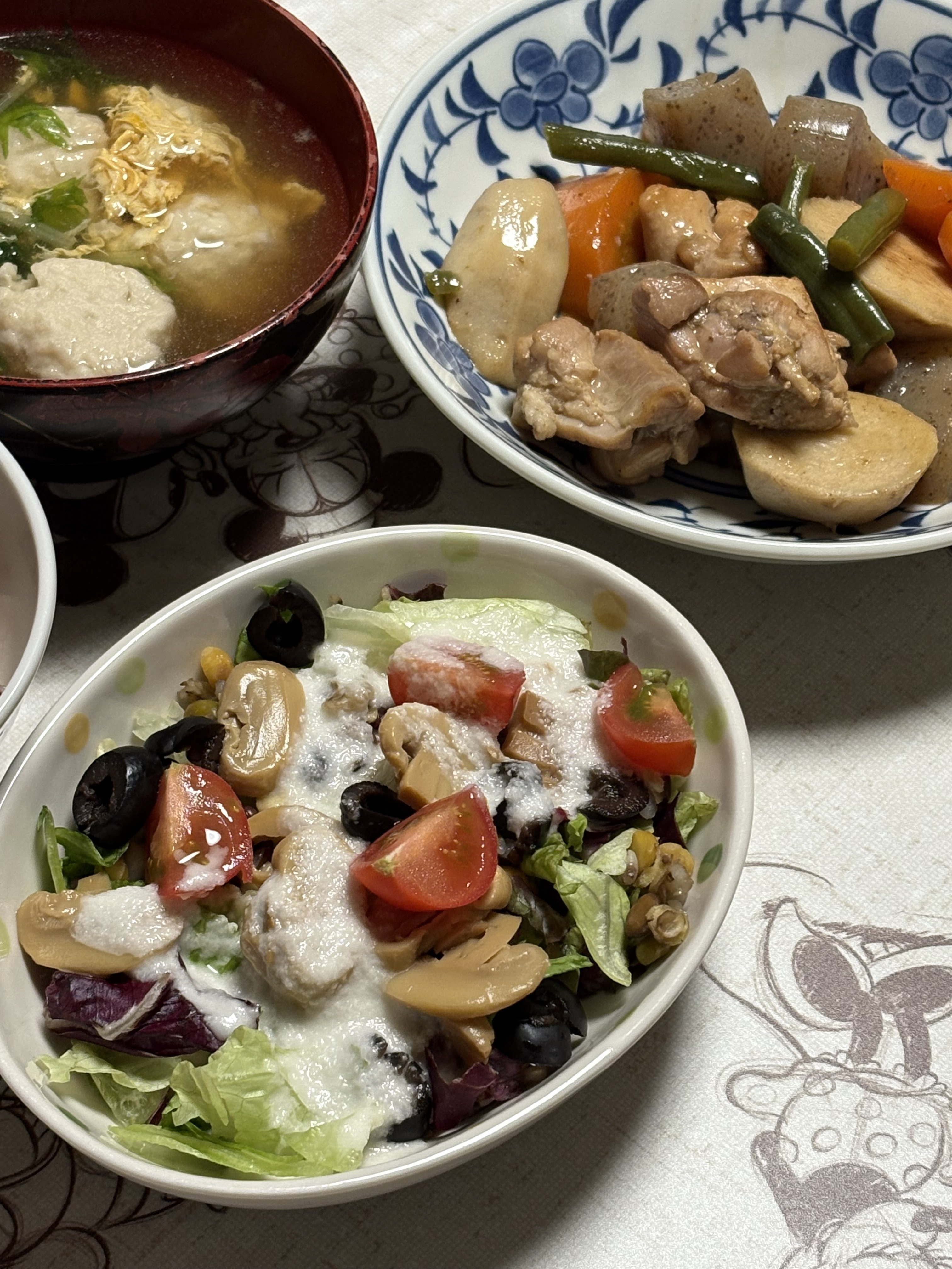 鶏肉と野菜の煮物とQummyさんのオリーブと雑穀サラダ