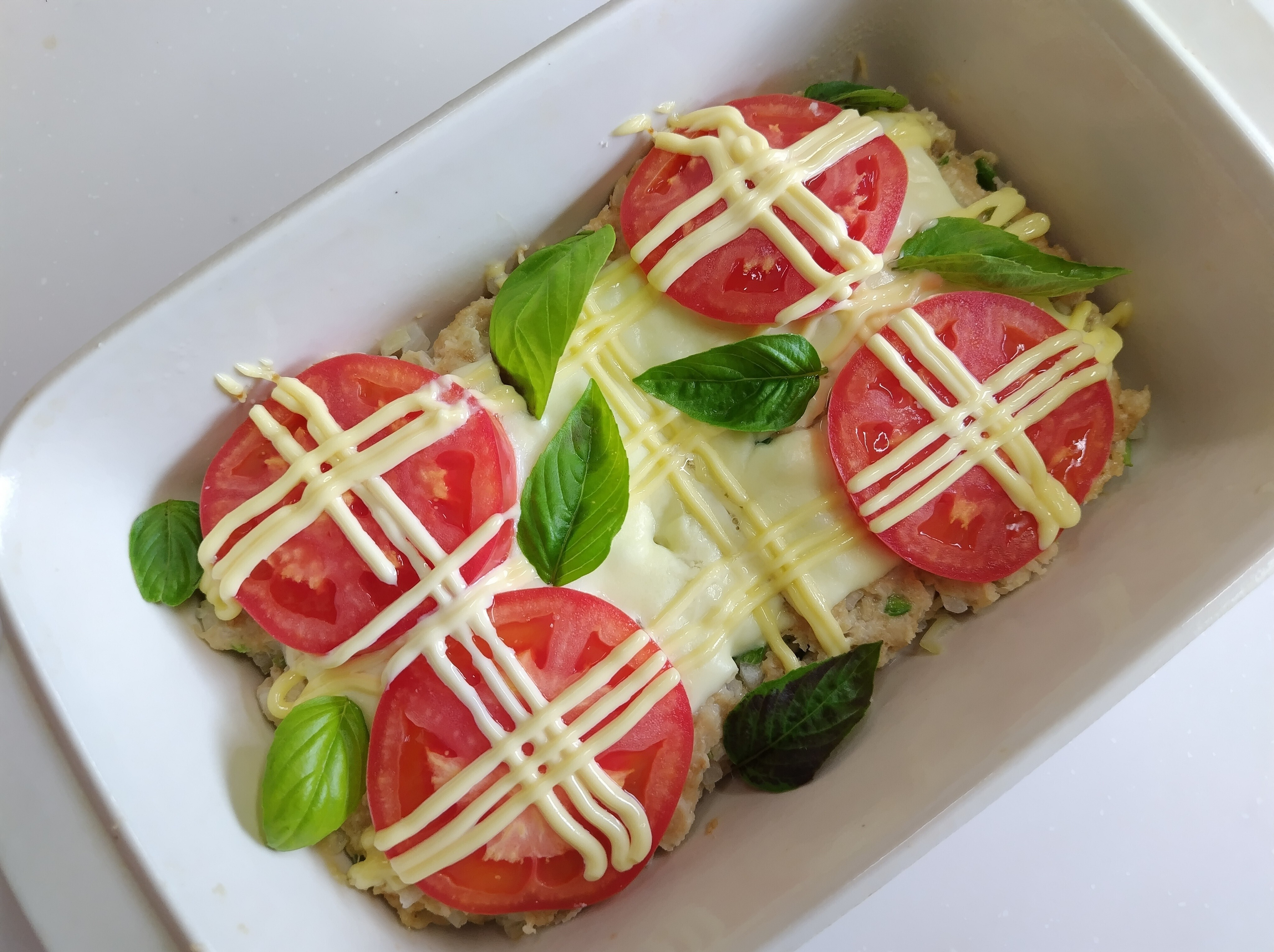 ひき肉に玉ねぎ•ピーマン•にんにくすりおろし•パン粉•塩•胡椒•マヨネーズ混ぜ、肉だねにスライスチーズとトマト🍅を2度重ね上にマヨネーズ線描きしてレンチン。バジル散らして、美味しく頂きました。
