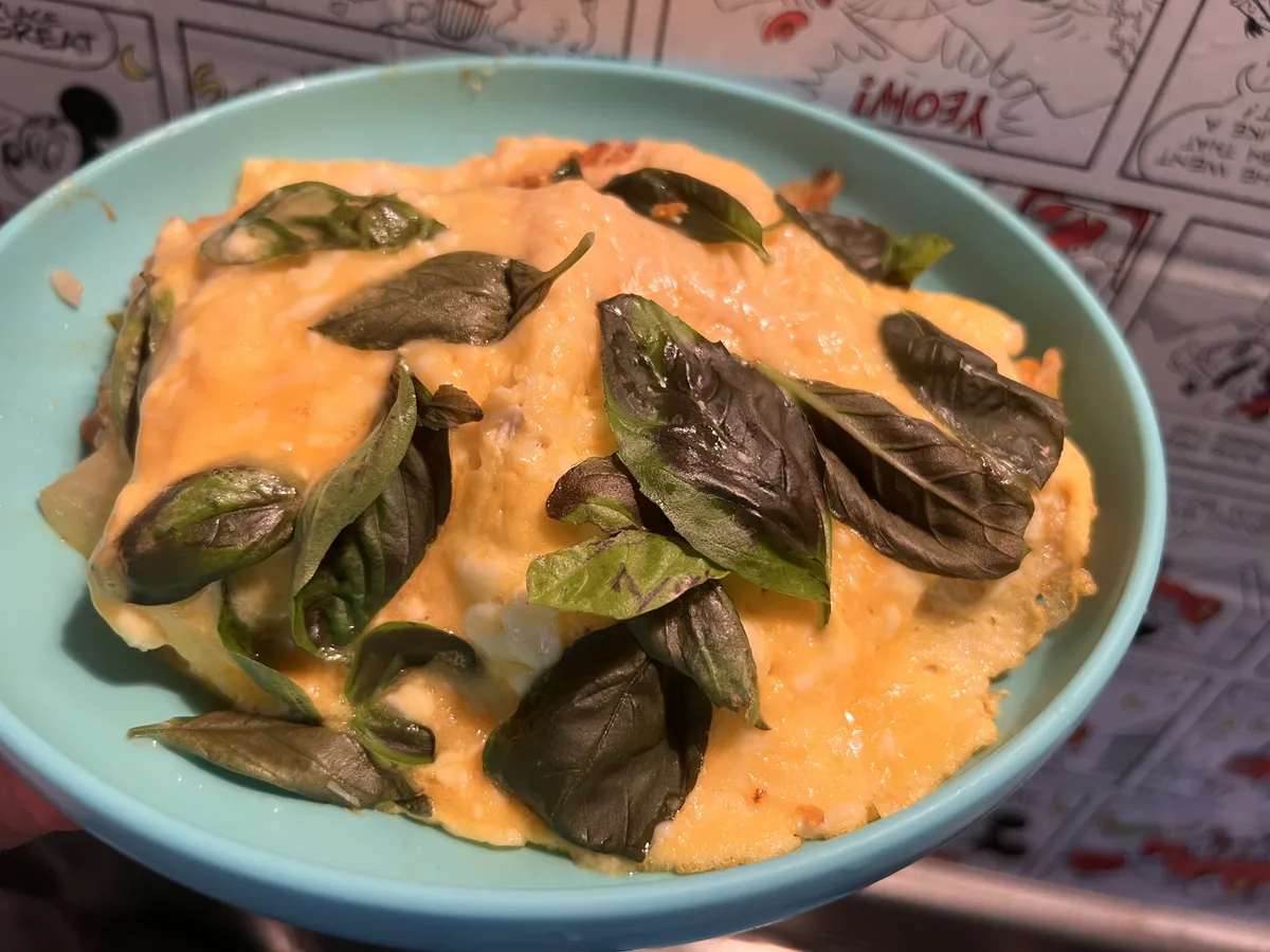 チーズも入れて雑に家で採れた終わり頃のバジルをのせたバジルオムライス。