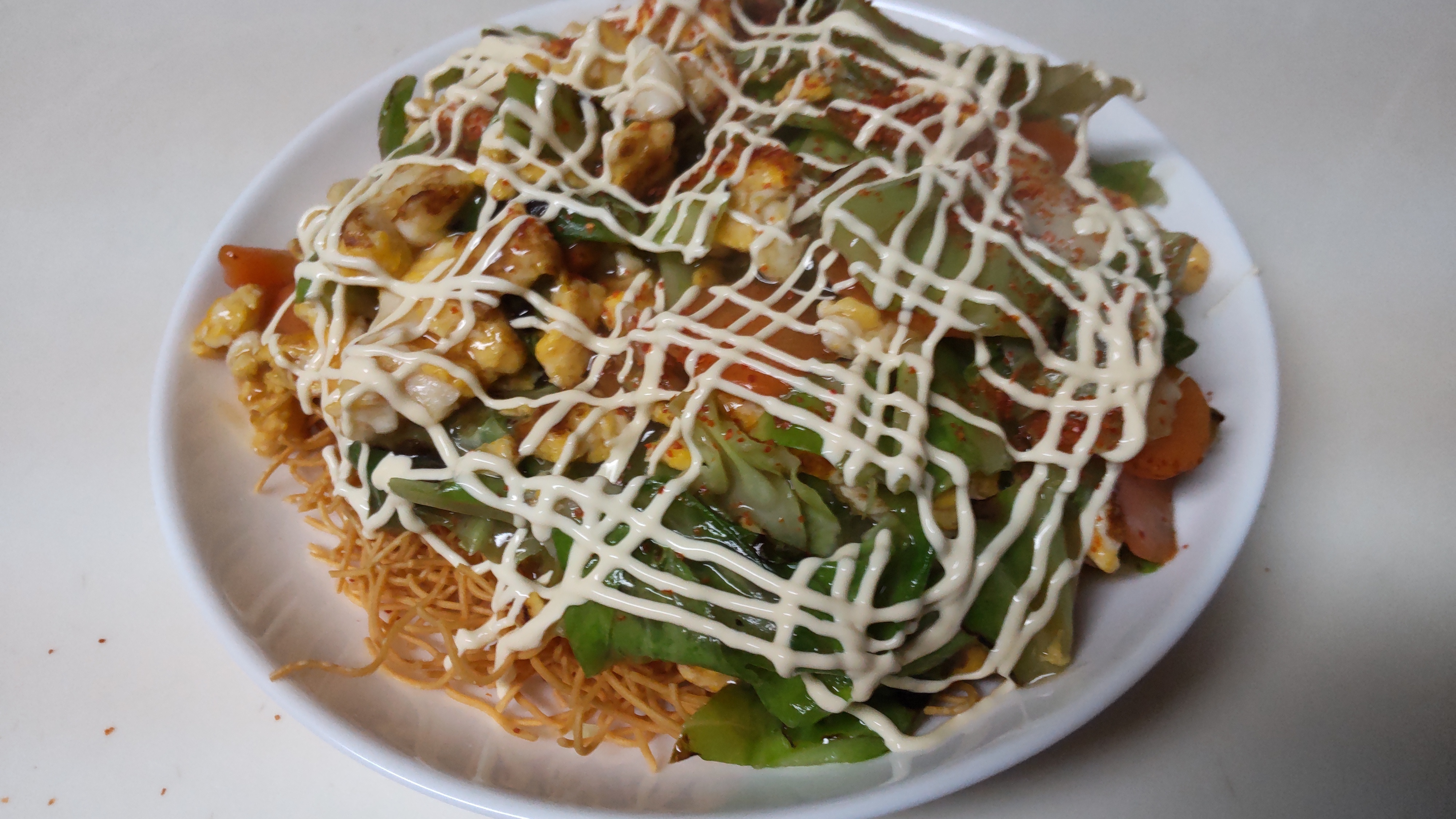 投稿を表示かた焼きそば、お野菜とマヨたっぷりで