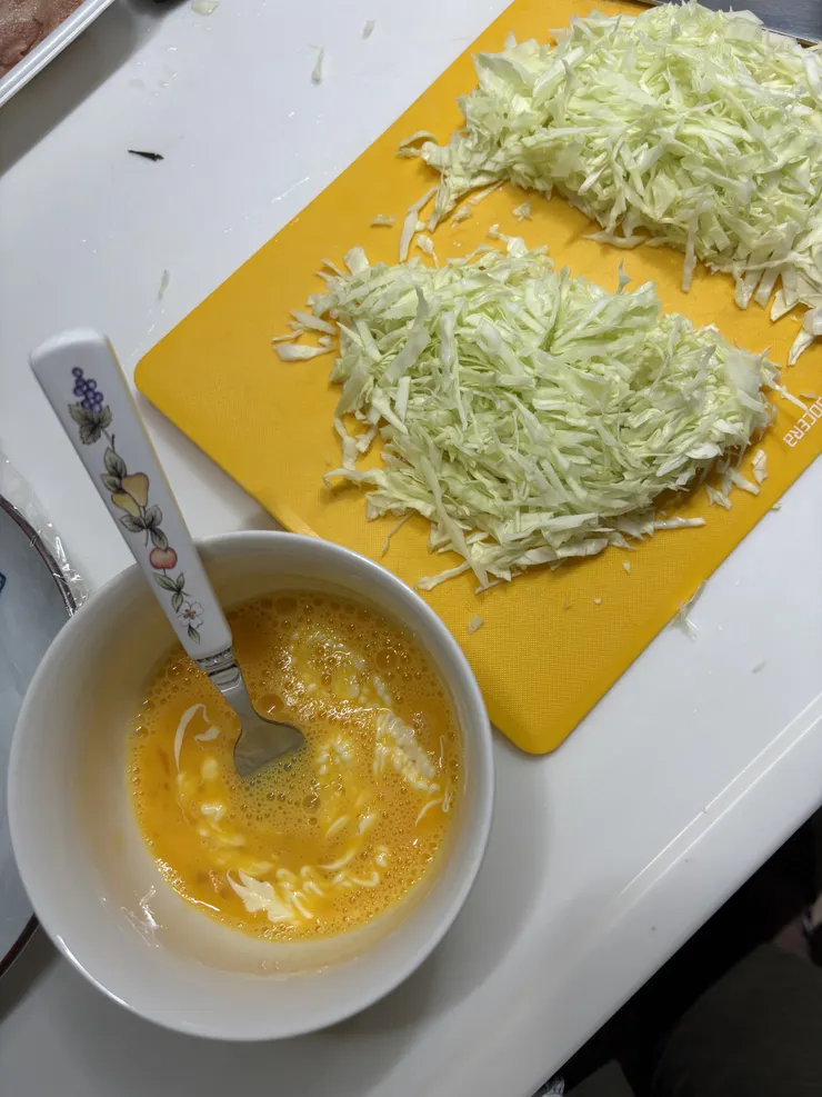 食材も卵、キャベツ、豚バラ肉です。お好み焼きのようですが小麦粉は入ってません。美味しいおかず一品になりました。