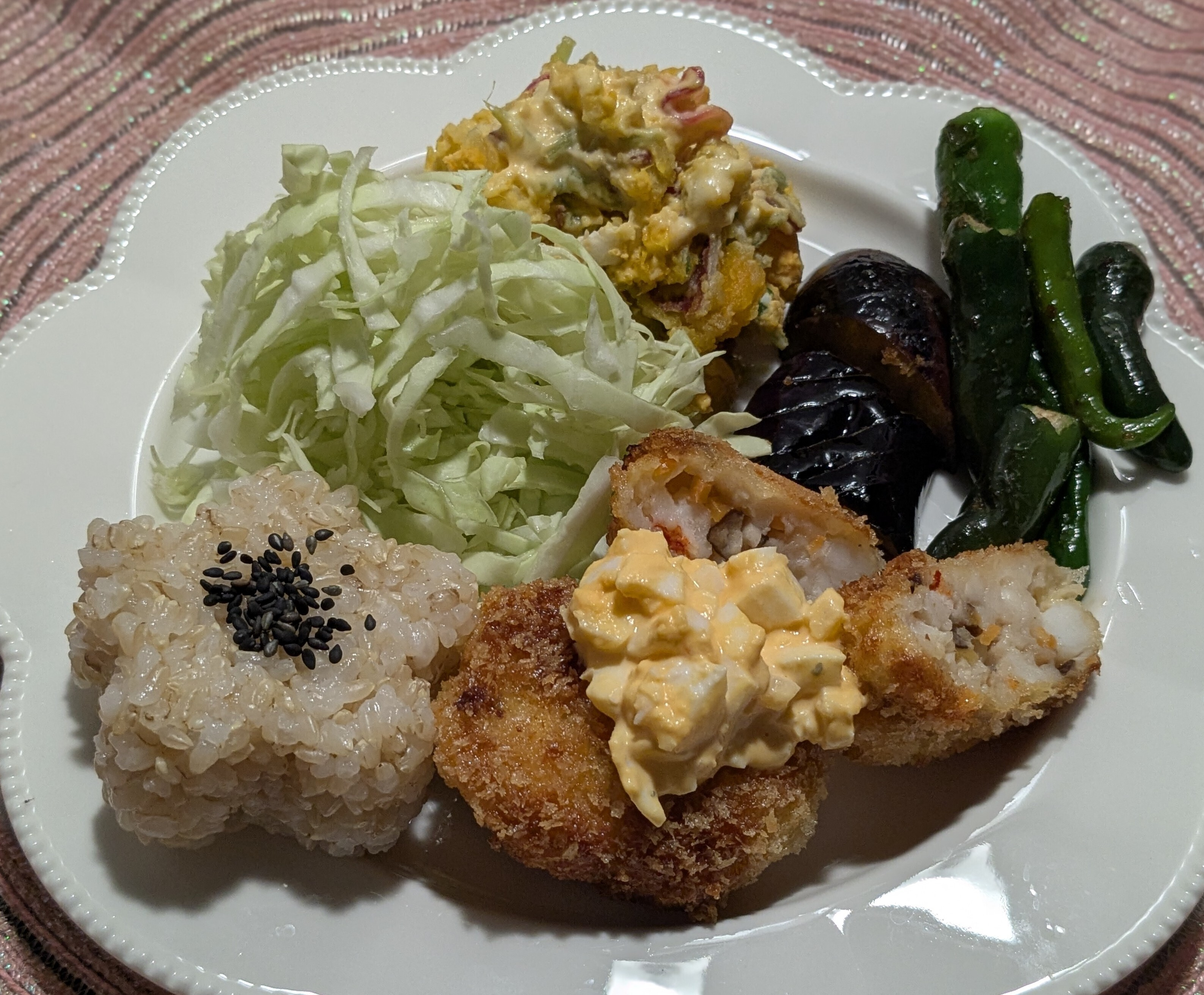 【海老カツ】【かぼちゃとさつまいものサラダ】【茄子と紫ししとうのソテー】