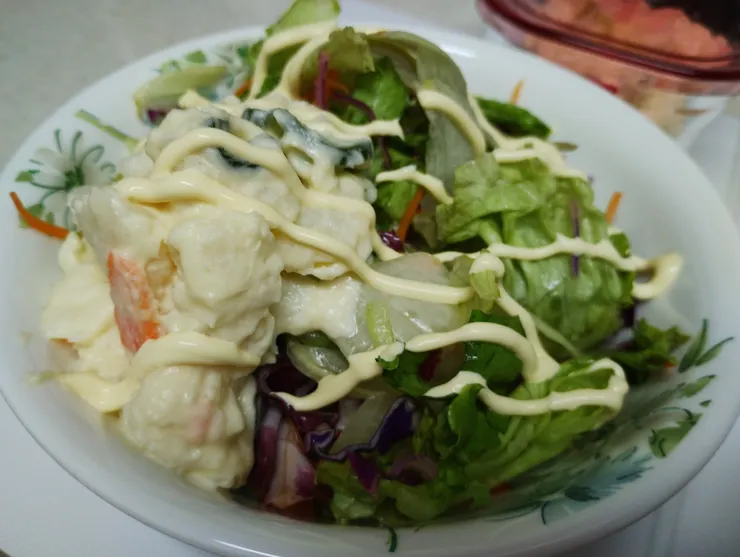 サラダクラブさんの10品目のサラダレタスやパプリカ と キユーミーさんのポテサラにキユーピーハーフをかけて頂きました