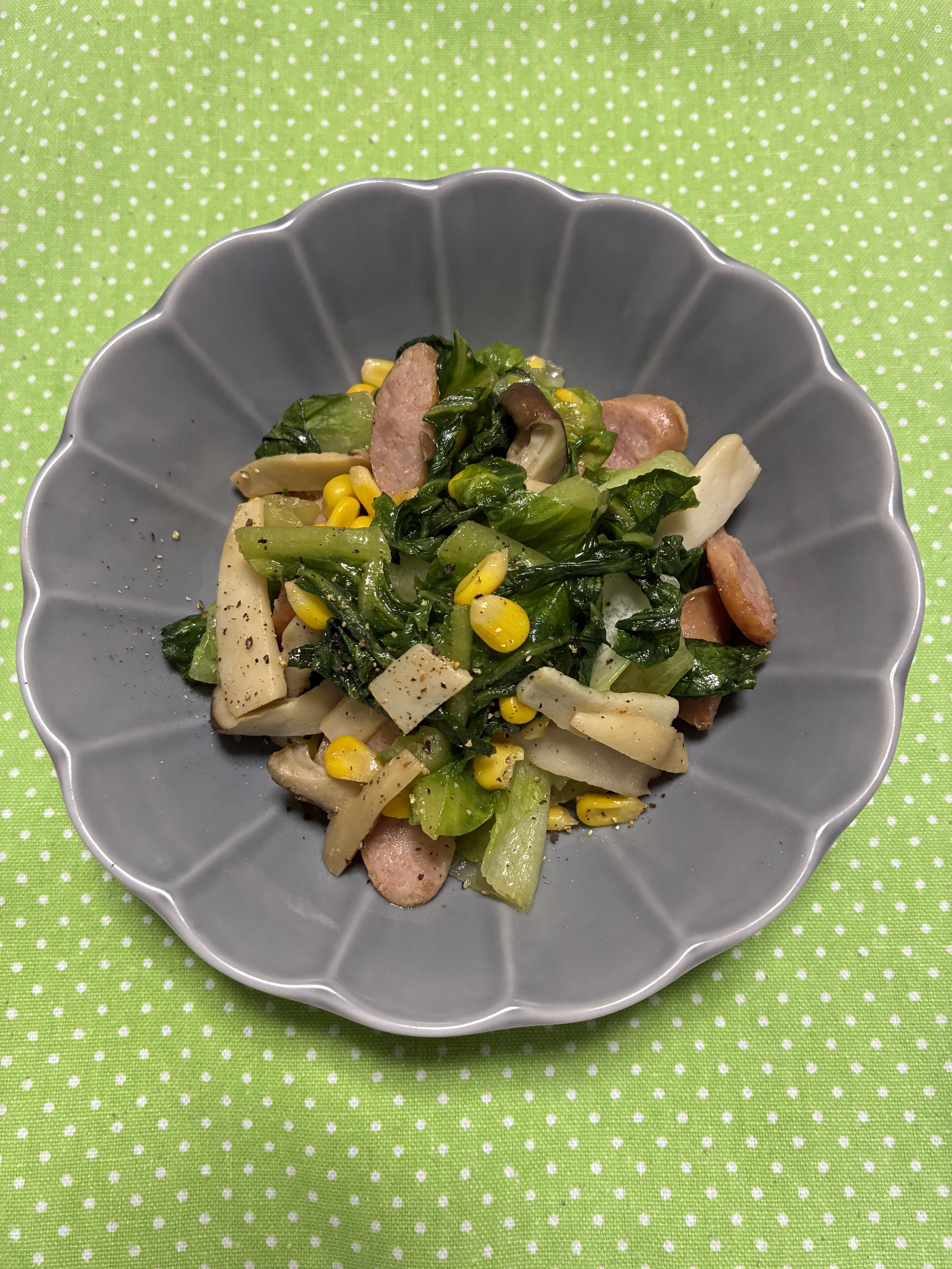 ロメインレタス、エリンギ、コーン、ソーセージで作りました!