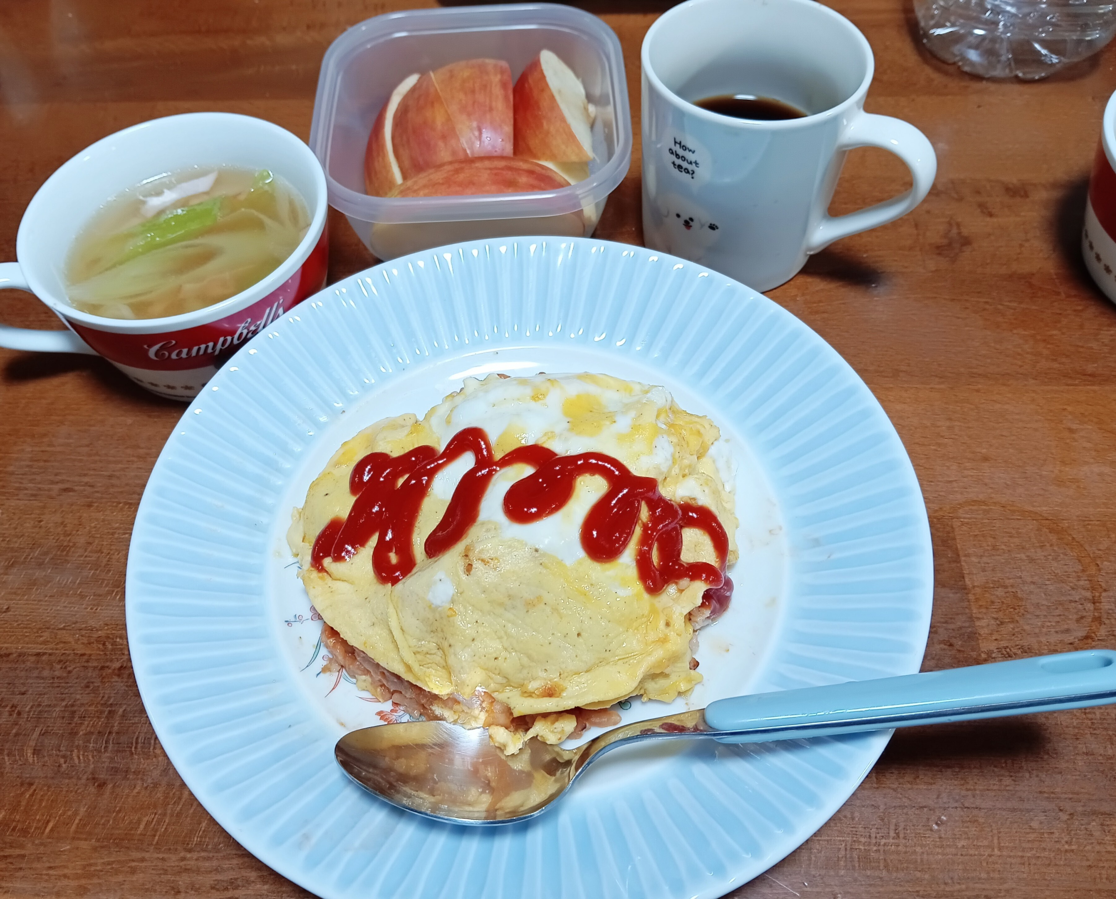 ねぎとハムの中華スープ、林檎、珈琲。