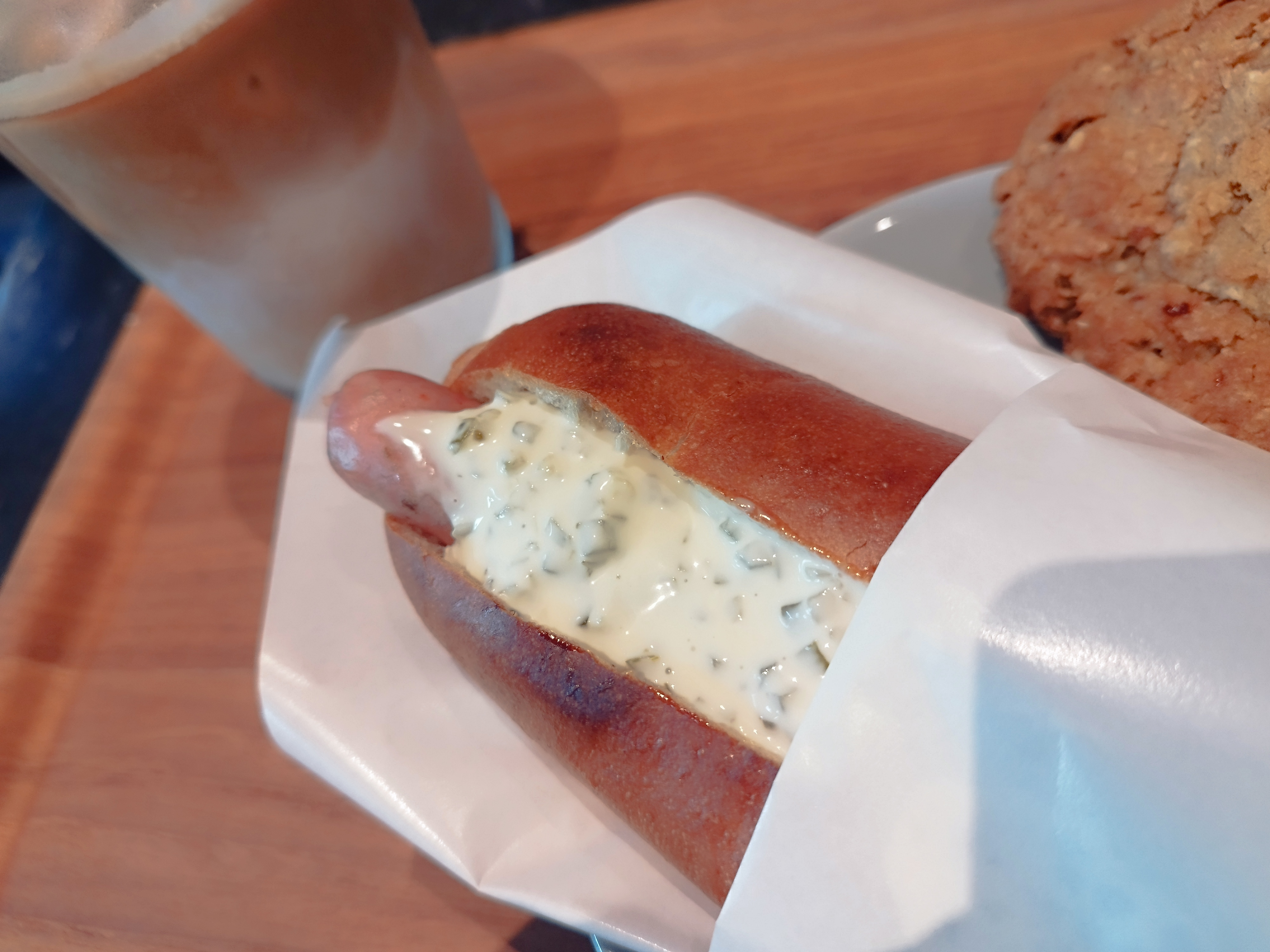 カフェでたまたま見つけたタルタルタップリのホットドッグ。とてもおいしかったので、マヨフォトに。