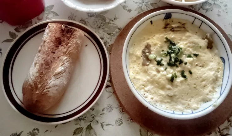絹豆腐、卵、舞茸、マヨネーズ、顆粒だしを混ぜて、電子レンジで加熱。