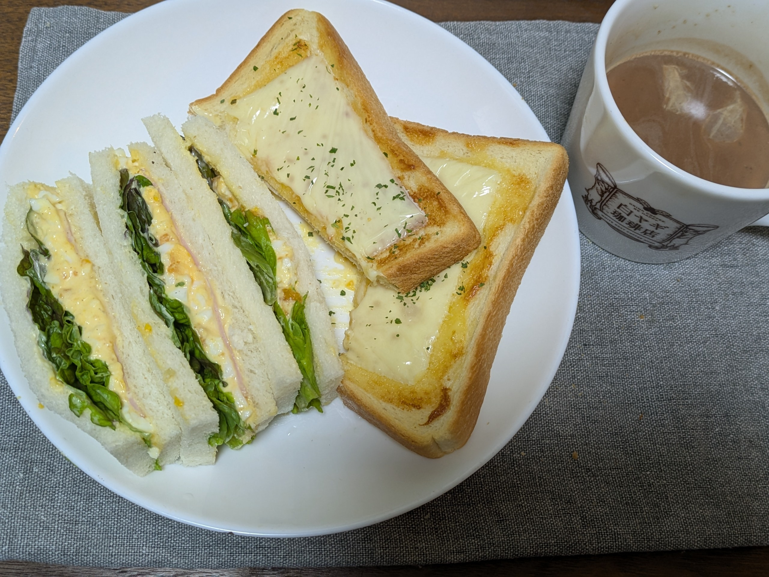 マヨトーストもたまごサンドも食べたくて決めかね…両方作ってしまいました。優柔不断。半分朝、お昼ご飯は残り食べる感じ。