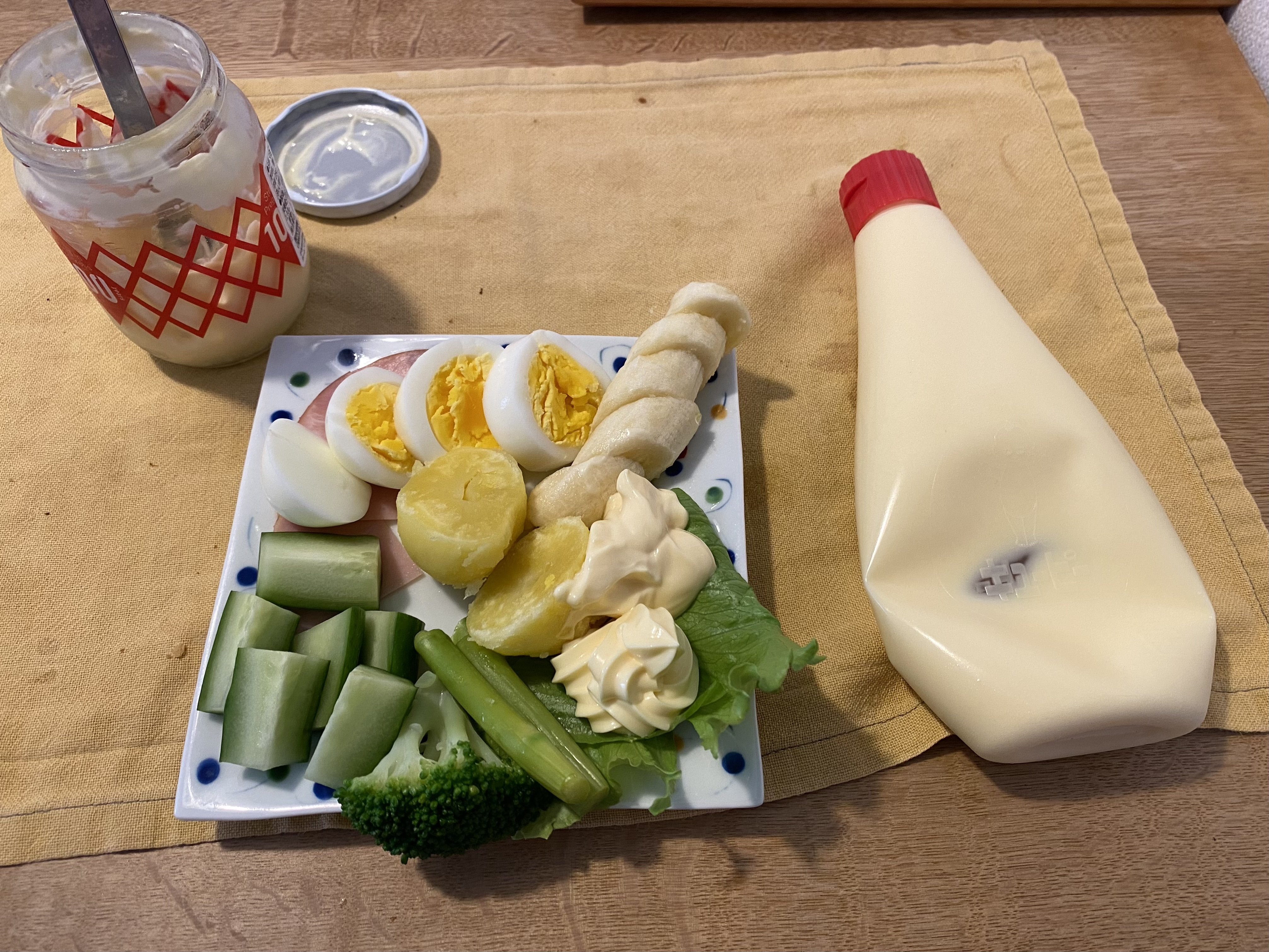 じゃがいも、ブロッコリー、ゆで卵など、マヨネーズに合う食材盛り合わせでバナナものせました。