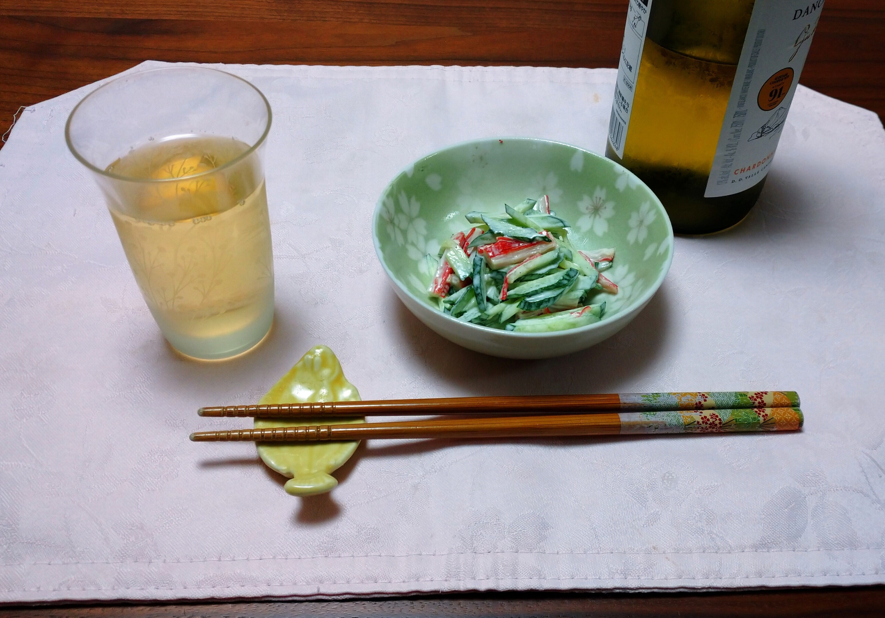 投稿を表示カニかまキュウリにワイン最高ですねえ