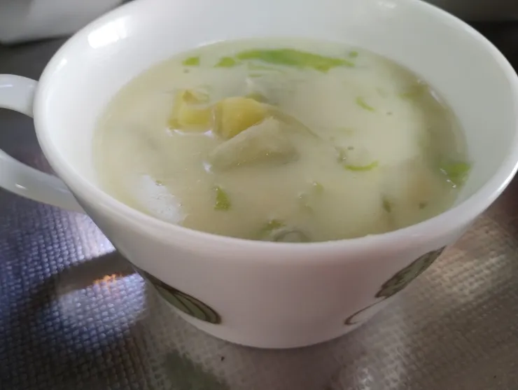 キユーピー3分クッキング野菜を食べよう!チャウダーの素を使ってスープを作りました。(牛乳の代わりに豆乳を使用 )