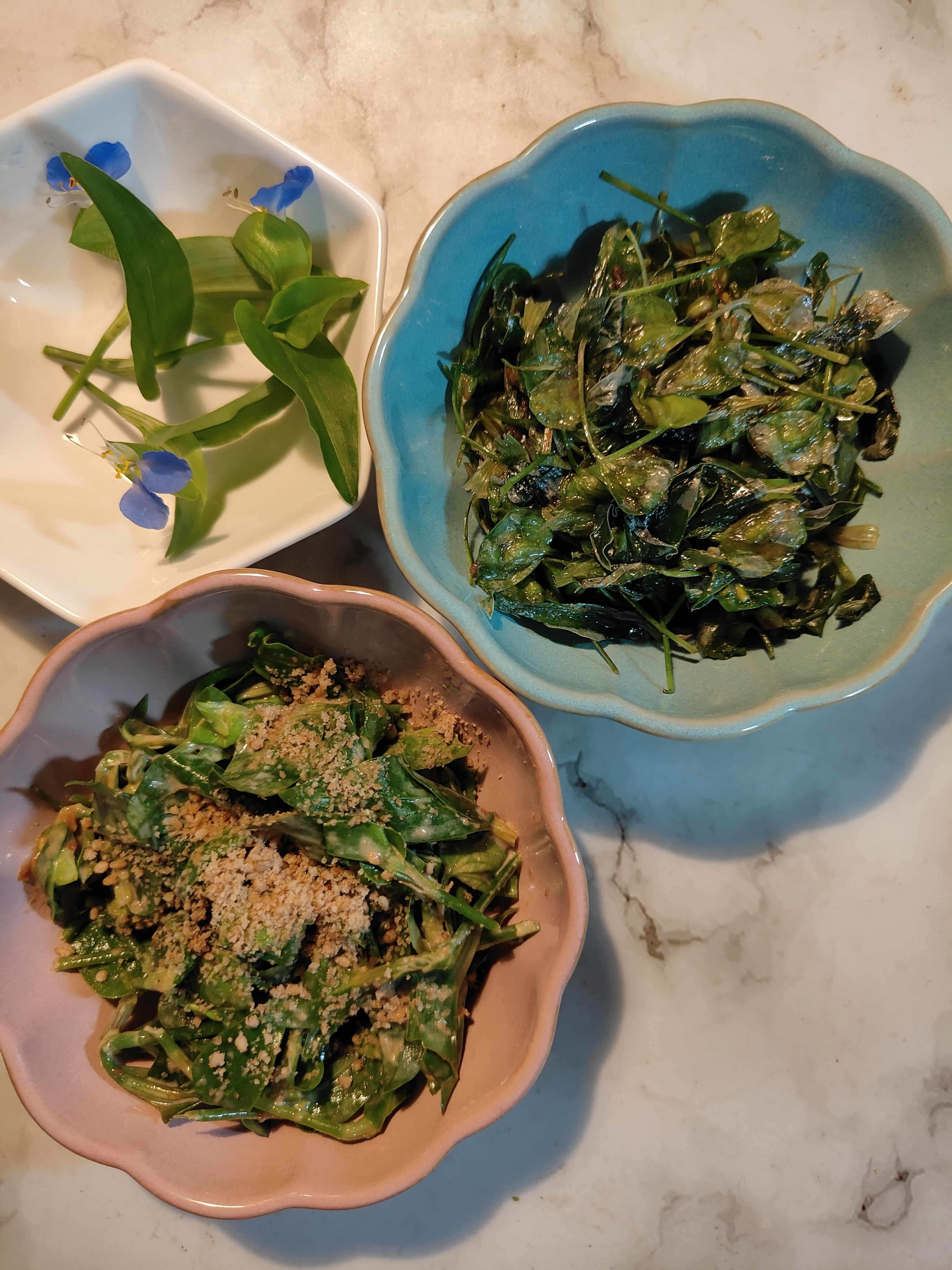 🩷ピンクの器は…露草の先っちょの柔らかいところをさっと茹でた味噌マヨ胡麻和え♪