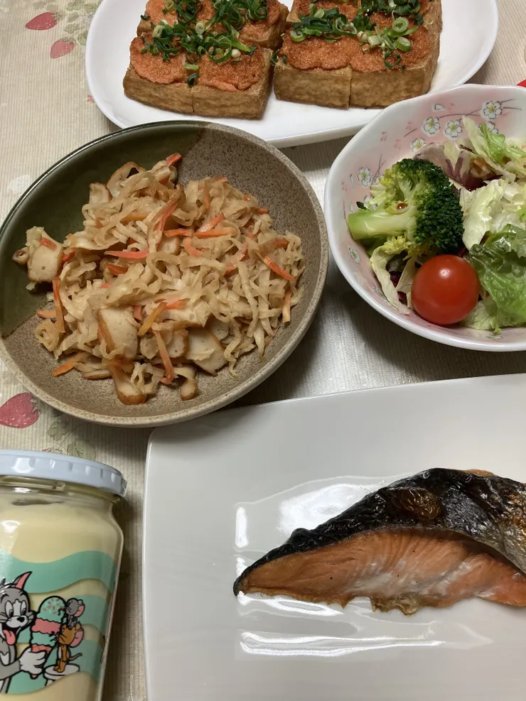 厚揚げにたらことマヨネーズを混ぜてトッピングし焼きました。