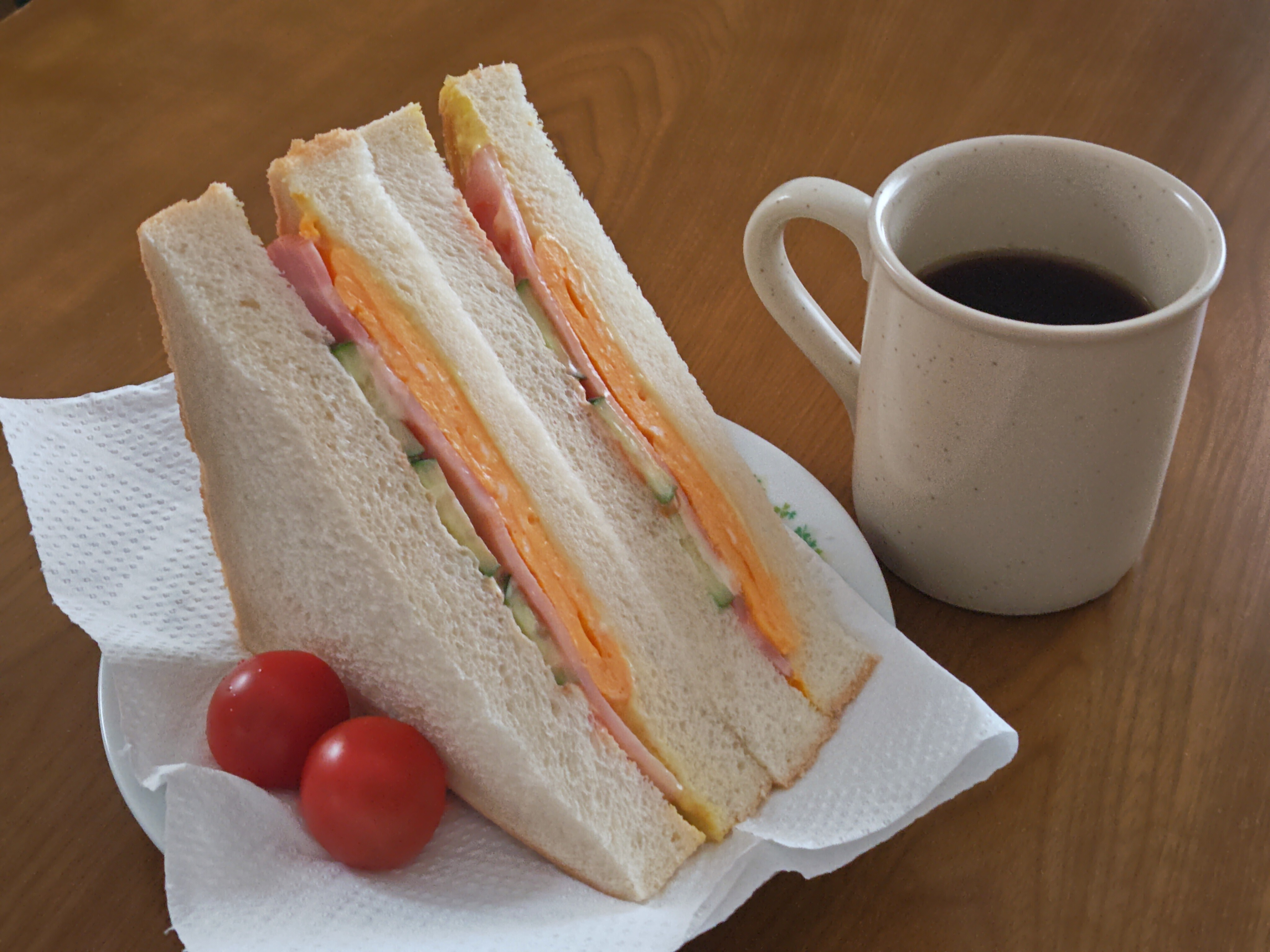 2枚の食パン内側にはマヨネーズ、マスタードを塗っています。挟んだのは、玉子焼き(マヨ、生クリーム、砂糖、塩入り)、ロースハム、キュウリ、黒コショウ、コク深アイオリ味のマヨを少々。今回、チーズは入っていません(忘れた)