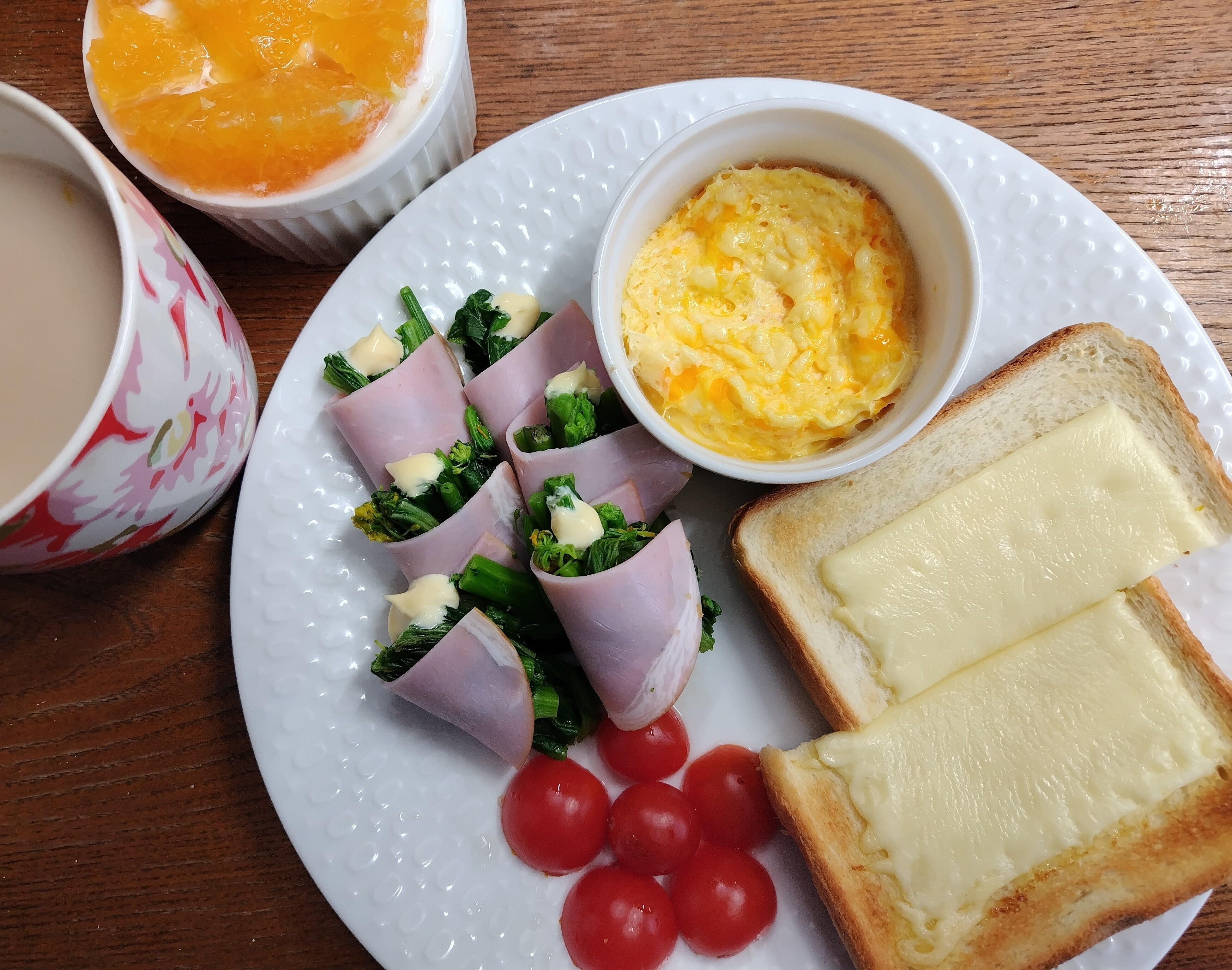 スクランブルエッグにマヨネーズ。さっと茹でた菜花をハムで巻きマヨネーズと深煎りごまドレッシングで。🌻