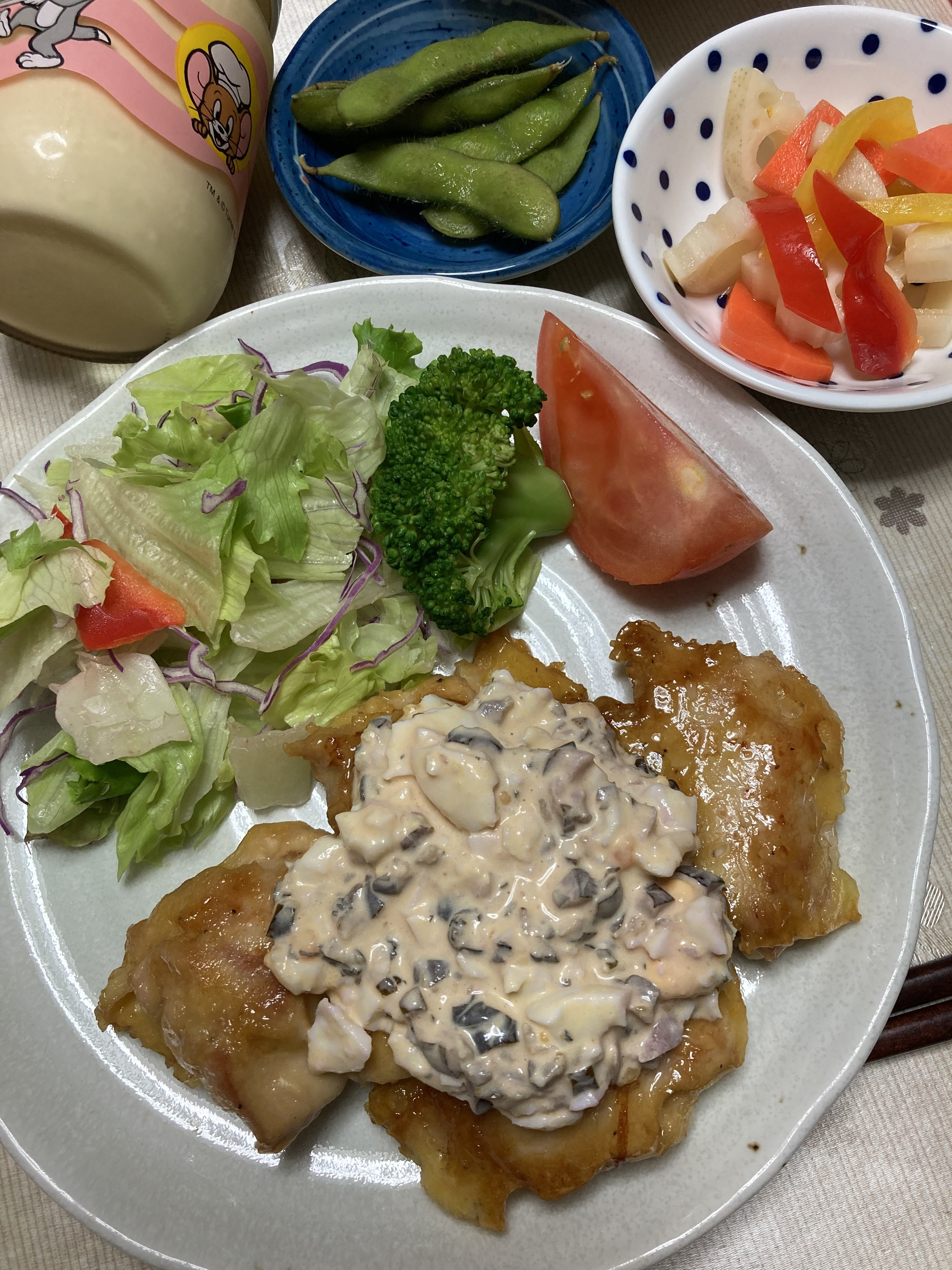 投稿を表示チキン南蛮に、しば漬けいりのタルタルソース美味しそうですね。ピクルスもおいそうです。🌻