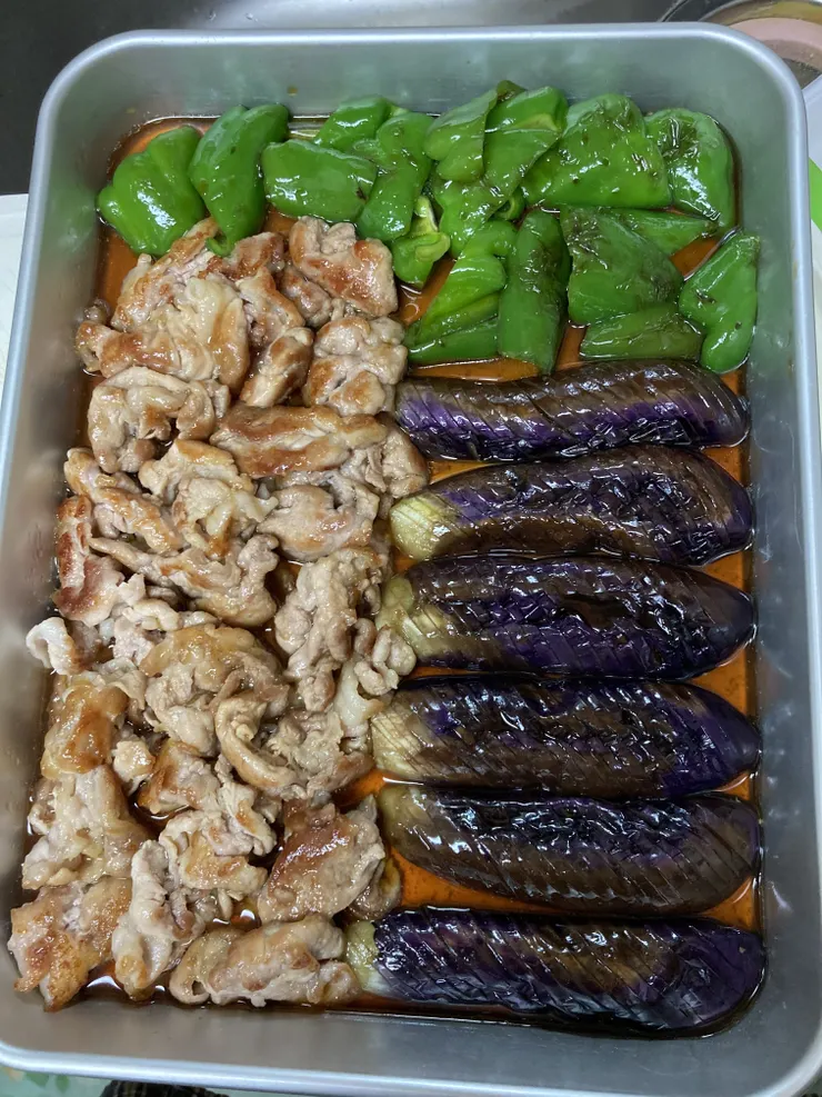 なす・豚こま・ピーマンは、マヨで焼いてからタレに漬けました。